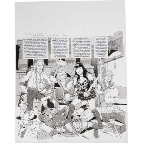 <B>Angelo Torres - Mad Magazine #349, Splash Page 1 “Jerkules” Original Art (EC, 1996).</B></I> They're strong, quick to fight, and slow to register any sort of of emotion or acting talent! Jerkules, son of Zoos, and Zima, the mighty princess warrior, are pricked with something mightier than their swords -- the pen of Angelo Torres! This first page has an image area of 18" x 17.5”, and the condition is Excellent. Signed twice and inscribed at the top left by Angelo Torres.