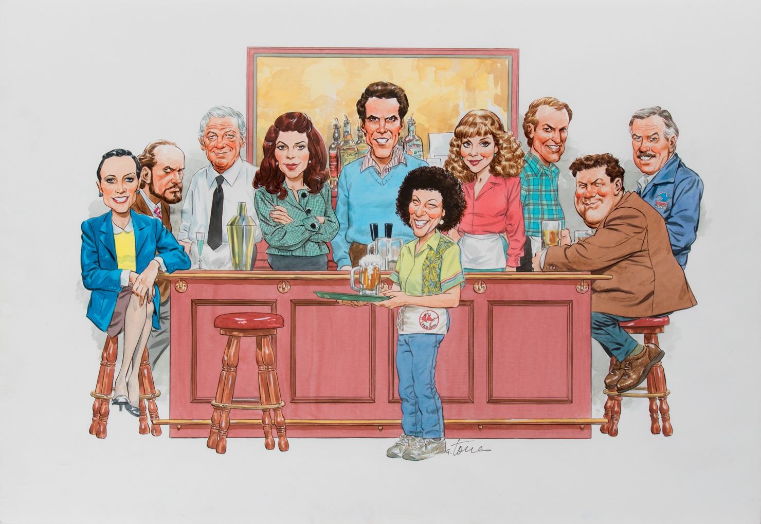 95. Angelo Torres original caricature artwork featuring the cast of Cheers. (ca. 1980s) Accomplished in pencil and gouache on large 20 x 29 in. lightweight art board. Almost certainly published, though use unknown. Featuring the MAD artist's characteristically impeccable comic likenesses of "Sam", "Rebecca", "Diane", "Woody", "Carla", "Norm", "Fraiser" and the rest of the regulars in the most popular sitcom of its era. Signed as "A. Torres" In very good condition. $2,000 - $3,000