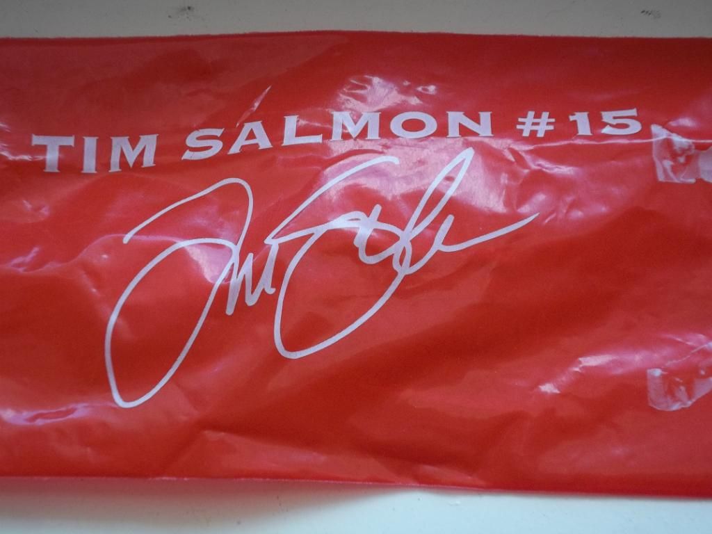 Red cheer stick with Tim Salmon #15 picture and autograph on it