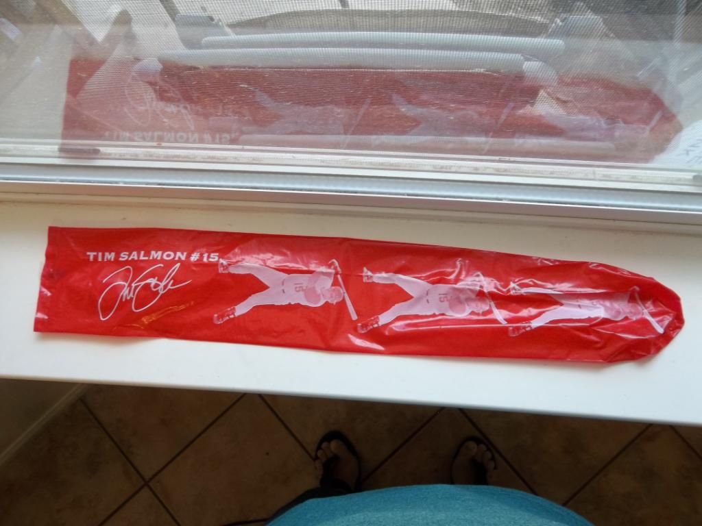 Red cheer stick with Tim Salmon #15 picture and autograph on it