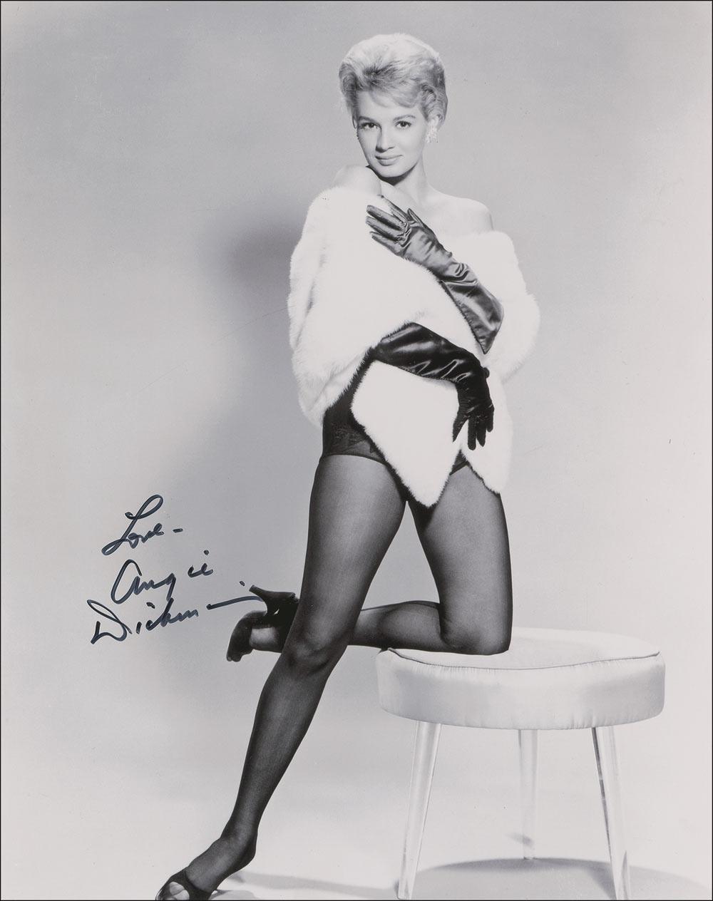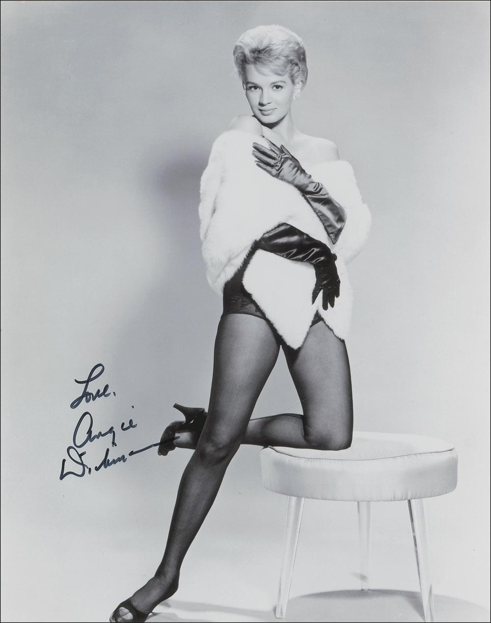 Two identical 10 x 12.5 glossy photos of a young Dickinson wrapped in fur, each signed in black felt tip, “Love, Angie Dickinson.” In fine condition, with a couple scattered surface creases.