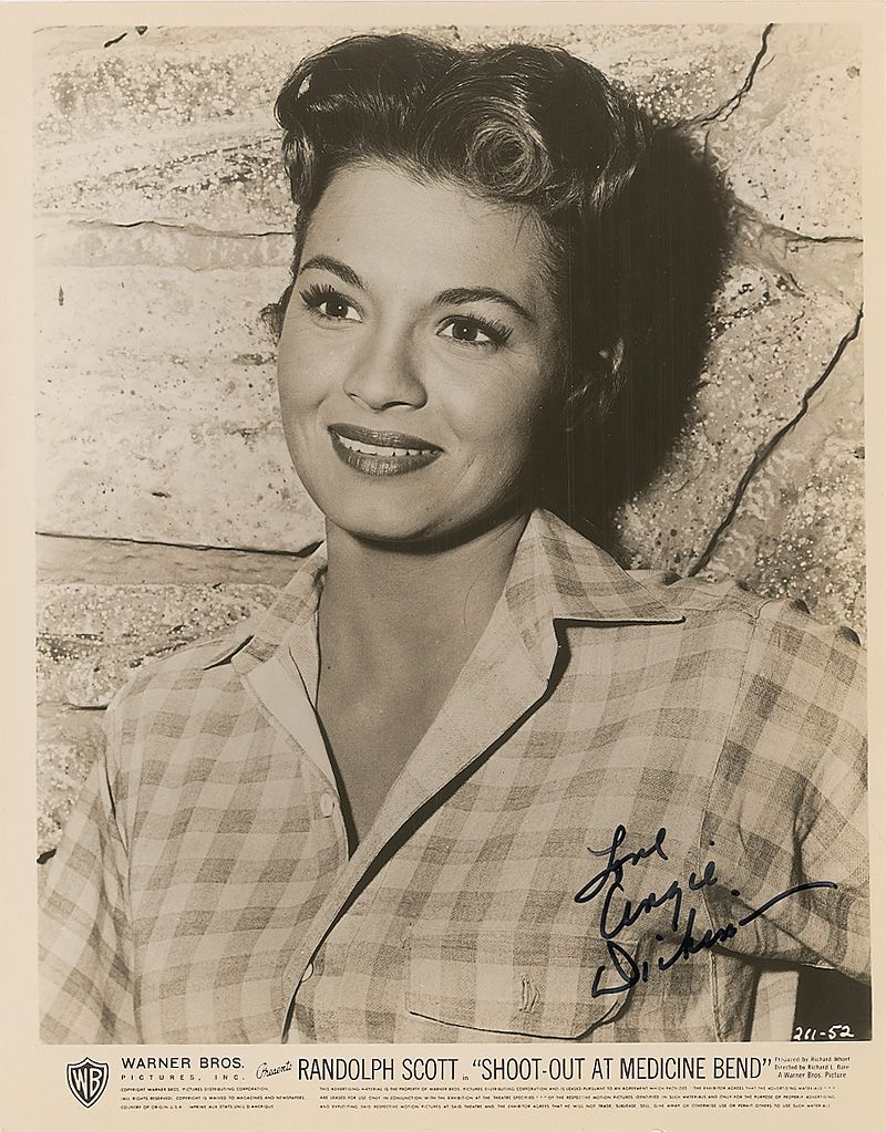 Glossy 8 x 10 Warner Bros. promotional photo for Dickinson in Shoot-Out at Medicine Bend, signed in black felt tip, “Love, Angie Dickinson.” A light uniform shade of toning, mild scattered creases and impressions, a slight ding to the bottom edge, and and some vertical streaking to the finish, otherwise fine condition.