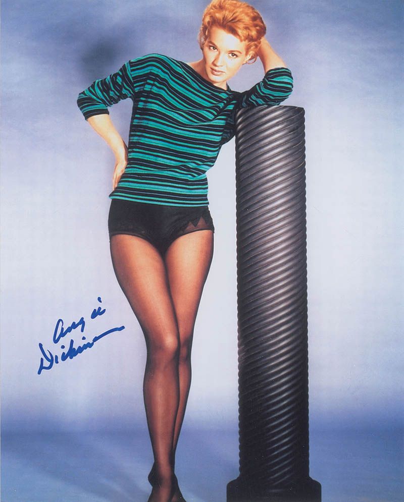 Color satin-finish 8 x 10 photo of Dickinson showing off her nylon-covered legs, signed in-person in blue felt tip. In very fine condition.