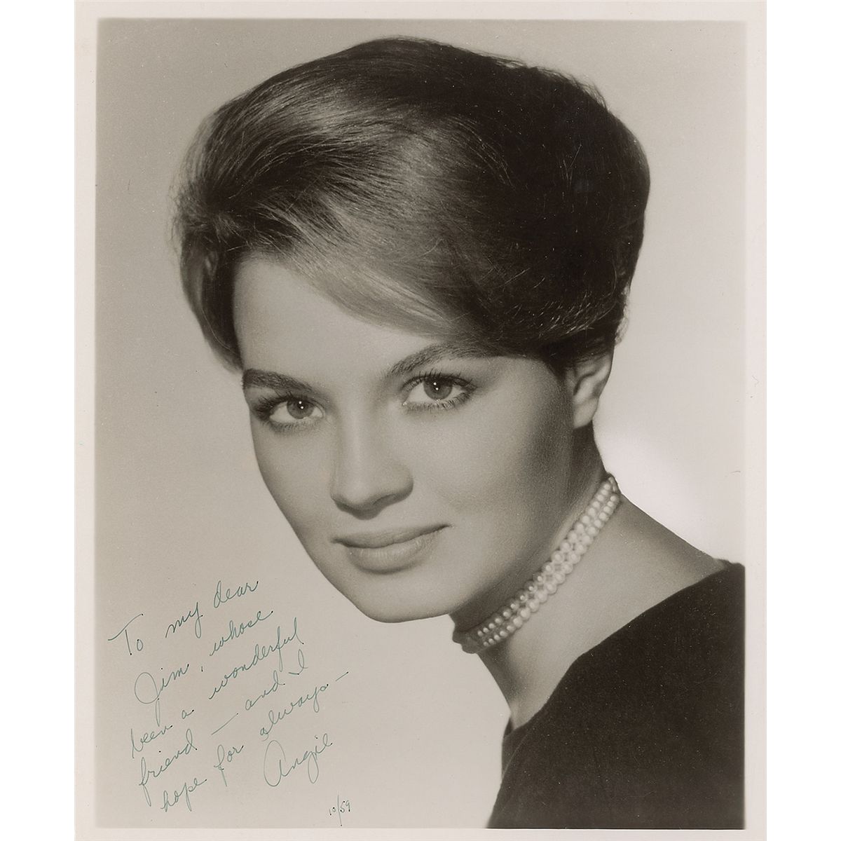 Lovely glossy 8 x 10 photo of Dickinson, signed and inscribed in black ink, “To my dear Jim, whose been a wonderful friend—and I hope for always—Angie, 10/59.” In fine condition, with light scattered spotting to the surface.