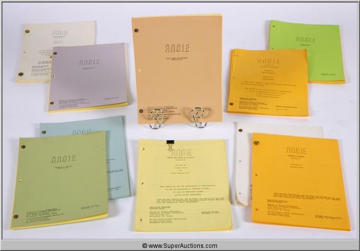 "Angie" Scripts / Paramount Pictures Corporation, A Miller-Milkis-Boyett Production ~ "Angie's old Friends" / #60432-014 / Revised Shooting Script / July 25, 1979 ~ "Family Fued" / #60432-024 , Shooting Script / October 26, 1979 ~ "Joyce's Ex" / #60432-026 / Final Draft / October 31, 1979 ~ "Angie and Joyce Go To Jail" / #60432-026 / Shooting Script / November 2, 1979 ~ "Harvey's Mother" / #60432-027 / Revised Shooting Script / November 13, 1979 ~ "Marie Moves Out" / #60432-029 / Final Draft / November 27, 1979 ` "Theresa's Gigolo" / #60432-031 / Shooting Script / December 17, 1979 ~ "The President's Coming, The President's Coming" / #60432-034 / Revised Final Draft / January 23, 1980 ~ "February Fever" / #60432-035 / Shooting Script / January 31, 1980 ~ "Angie And The Doctor" / #60432-036 / Shooting Script / February 7, 1980