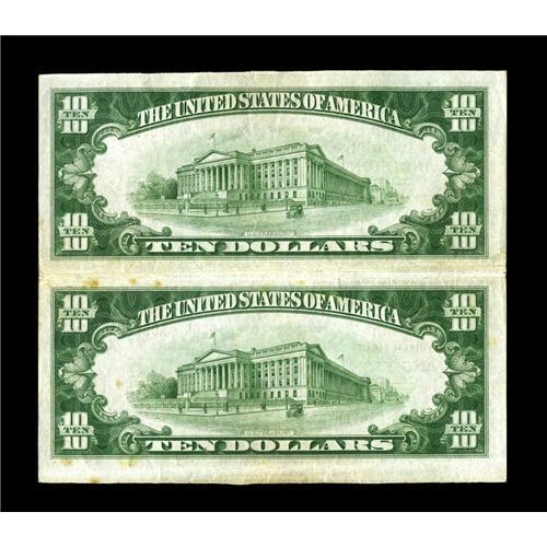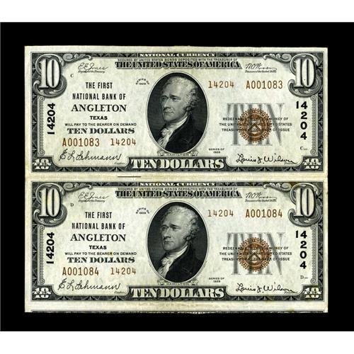 <B>Angleton, TX</B></I> - $10 1929 Ty. 2 <B>The First NB </B></I> Ch. # 14204 Uncut Pair<BR>Interesting to find an uncut pair on this 14000 charter bank that was not chartered until June 1934. The lateral folds are found between the two notes and along the bottom edge. A few light spots are noticed on the back. <B>Very Fine-Extremely Fine.</B></I><BR><BR><b>Shipping:</b> Coin/Currency (<a target="_blank" href="http://www.heritageauctions.com/common/shipping.php">view shipping information</a>)