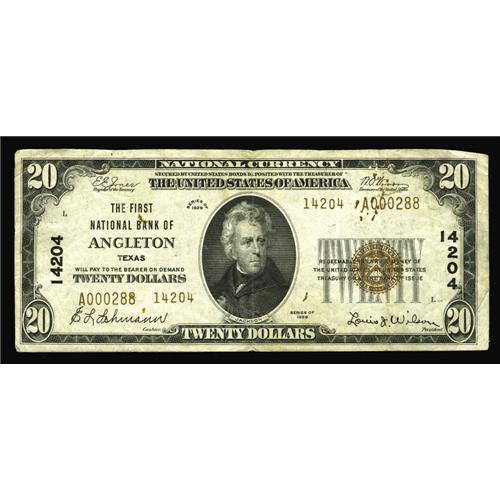 <B>Angleton, TX</B></I> - $20 1929 Ty. 2 <B>The First NB</B></I> Ch. # 14204<BR>This was the only national bank in town. The First was not chartered until 1934 thus earning this Brazoria County bank a coveted 14000 charter number. Scattered paper clip rust is noticed on this <B>Fine-Very Fine</B></I> $20 from a scarce bank.