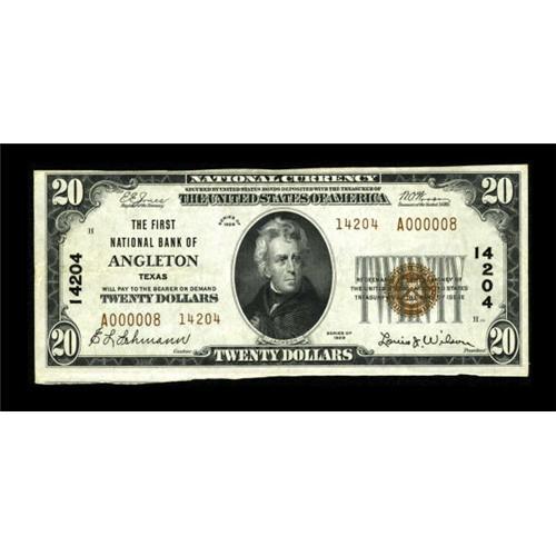 <B>Angleton, TX</B></I> - $20 1929 Ty. 2 <B>The First NB </B></I> Ch. # 14204<BR> Chartered in June of 1934, this Brazoria County bank is the only issuer for the town. Charter numbers above 14000 are highly sought after items. <B>Extremely Fine</B></I>.<BR><BR><b>Shipping:</b> Coins & Currency (<a target="_blank" href="http://www.heritageauctions.com/common/shipping.php">view shipping information</a>)