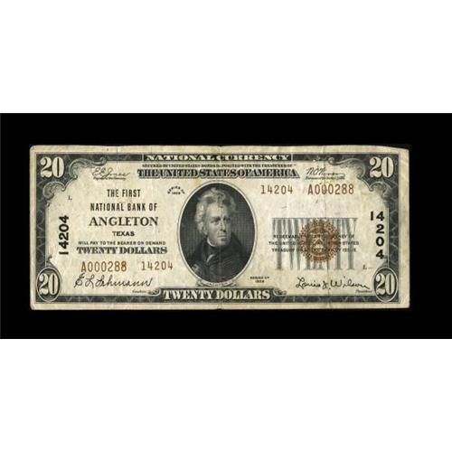 <B>Angleton, TX</B></I> - $20 1929 Ty. 2 <B>The First NB </B></I> Ch. # 14204<BR> While we have sold a pair of uncut sheets from here plus one high grade single note, this is by no means a common bank. <B>Fine-Very Fine,</B></I> with a few tiny rust spots, the only bank to issue in this small Brazoria County location.<BR><BR><b>Shipping:</b> Coins & Currency (<a target="_blank" href="http://www.heritageauctions.com/common/shipping.php">view shipping information</a>)