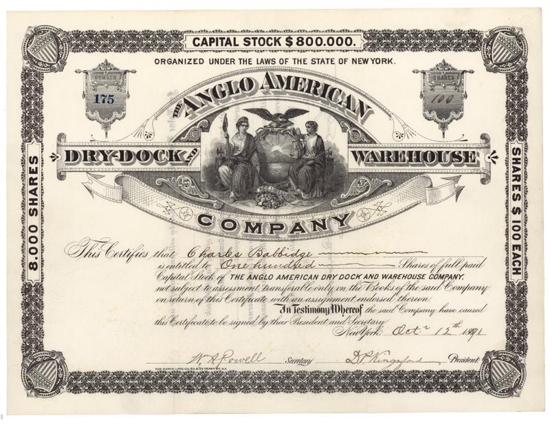 1891, New York. Stock certificate for 100 shares. Black. Large center vignette of the state seal of NY, with ornate border and shields in each corner of the certificate. Uncancelled and Extremely Fine.