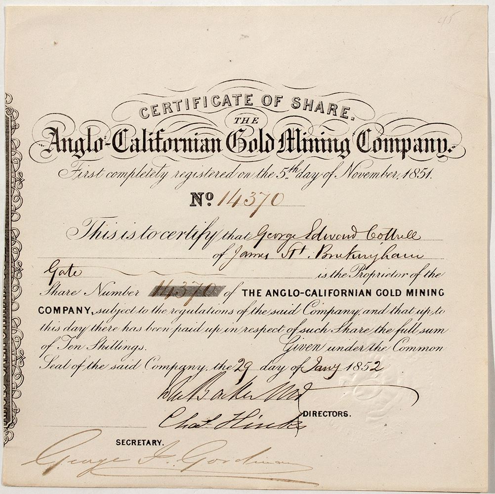 Rare. Inc. November 5th, 1851 in London. Certificate No. 14370 issued to George Edward Cottrell for one share for the sum of ten shillings on Jan. 29, 1852. Signed by two directors and the company secretary. No vignette. Approx. 8" x 8" square. According to Filer (Holabird), this was the largest foreign issue of a California Gold Rush venture that we know of. The company literally sold thousands of shares. The company began as the Anglo California Gold Mining & Dredging Co. in 1849., owned by Luke Williams. It was the last of Williams "gold bubble company promotions." Williams sent Henry Vere Huntley to Calveras River in 1849. Huntely was unsuccessful, so he hired miners of the Quartz Rock Mariposa Gold Co. and arranged a deal with them. While he was in America, the name of the company had changed. The lack of progress and name changing made the directors of the company very suspicious, and they forced Williams out in April 1851. The new directors decided to crush and process ore mined by others, and sent two steam engines and crushing mills on the Augusta that year. [Ref: Filer and "Money Pits: British Mining Companies in the Californian and Australian Gold Rushes of the 1850s, pg 76-77, Woodward] (Prag Collection)
