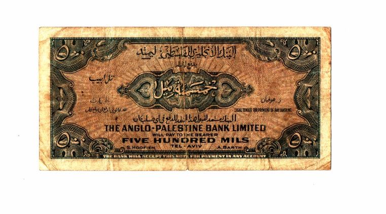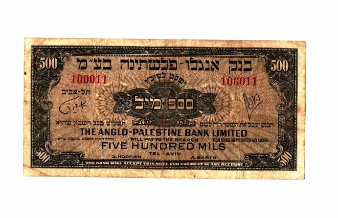 Anglo-Palestina banknote, 50 mill, unique serial no. 100011, condition F-VF.