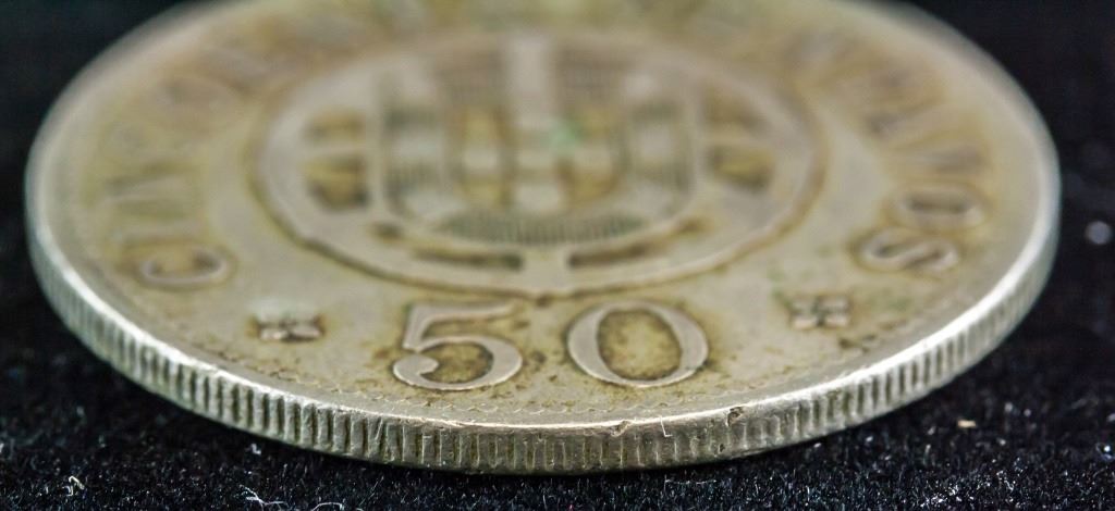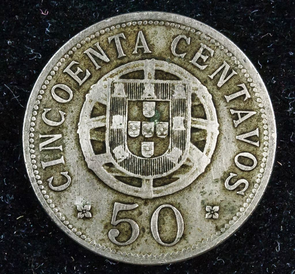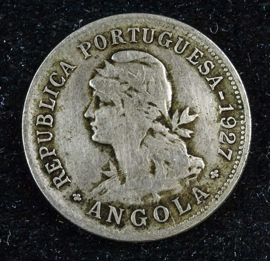 Angola coin. Obverse: Laureled, hooded bust with long hair facing left. Lettering: REPUBLICA PORTUGUESA - 1927 / ANGOLA. Reverse: Arms, value below. Lettering:CINCOENTA CENTAVOS / 50. 10 grams, diameter: 3 cm.