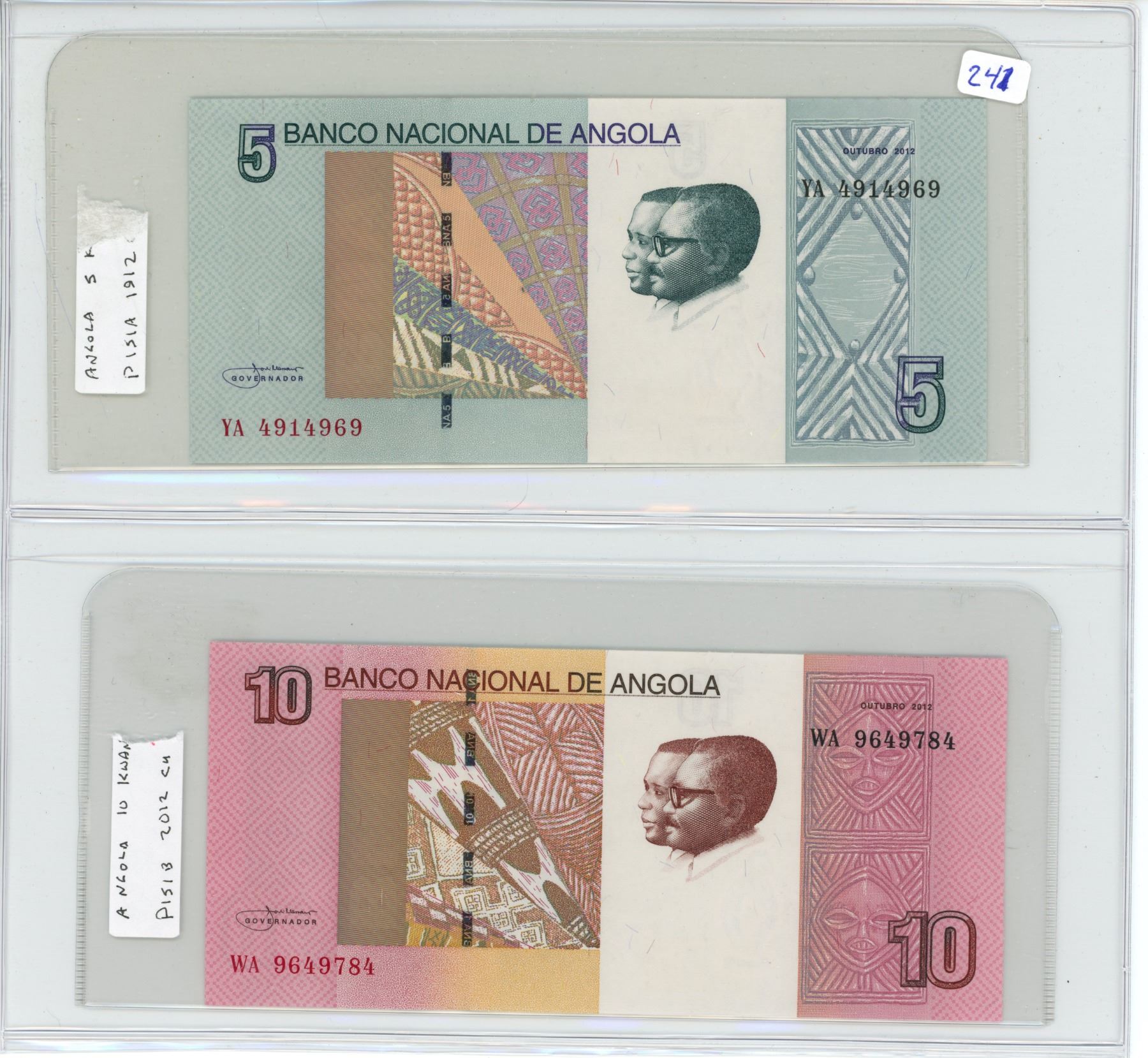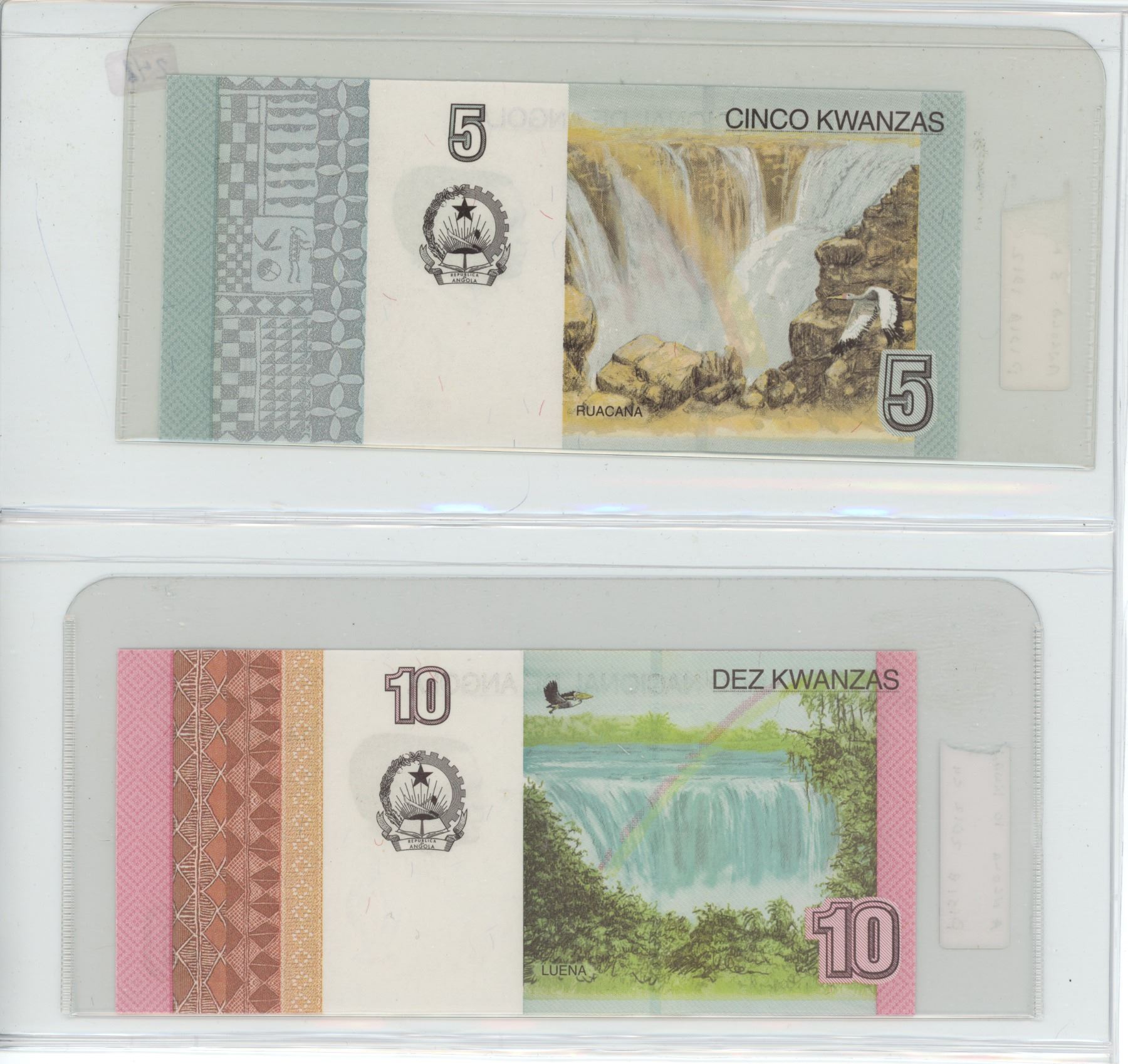Angola. National Bank of Angola. Lot of 2 2012 notes including 5 Kwanzas & 10 Kwanzas. Notes from this former Portuguese colony are hard to get. Uncirculated.