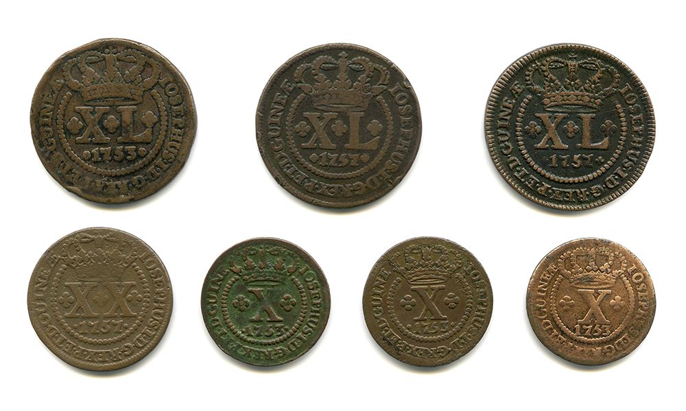 XL Réis 1753 data entre florões (04.02; AI C172) mossas BC+; 1757 (x2) data entre florões (04.03; AI C173) BC+ e MBC; XX Réis 1757 (03.03; AI C168) BC+; X Réis 1753 GVINE (x2) (02.03; AI C161) BC+, MBC e 1753 BC