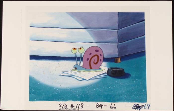 This reproduction background and animation cel is from the Nickelodeon TV show SpongeBob Squarepants. The story takes place under the deep blue sea in Bikini Bottom, where SpongeBob resides. SpongeBob, who is a yellow, porous sponge, is your typical happy-go-lucky character, as he is always cheerful and enjoys making people laugh. Patrick Star, SpongeBob's neighbor who is a starfish, is your average children's show idiot, as he boasts knowing nothing and is often getting himself into ridiculous situations. Between the homes of these two lies the home of the miserable Squidward, a squid, who is known for being grouchy and playing tricks on SpongeBob and Patrick. Both SpongeBob and Squidward work at the Krusty Krab, a fast food business run by the greedy money-loving Mr. Krabs, a crab, the arch rival of the evil, possibly misunderstood, Plankton. Another neighbor, Sandy Cheeks, an athletic squirrel who normally wears an astronaut's space suit, was introduced in "Tea at the Treedome." She spends most of her time inventing and experimenting. Gary looks angry.Original Printed Background and Animated Cel Overall Size of Background: 10 1/2" x 17" Overall Size of the Cels: 10 1/2" x 12 1/2" Very good conditionThis is an original hand-painted cel set-up used in the production of an episode of "SpongeBob SquarePants." Each one-of-a-kind set-up represents a slight change in position of the characters. When individually photographed and projected in rapid succession, the images appear to move.