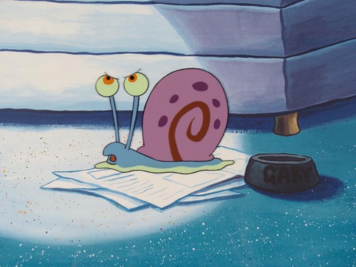 This reproduction background and animation cel is from the Nickelodeon TV show SpongeBob Squarepants. The story takes place under the deep blue sea in Bikini Bottom, where SpongeBob resides. SpongeBob, who is a yellow, porous sponge, is your typical happy-go-lucky character, as he is always cheerful and enjoys making people laugh. Patrick Star, SpongeBob's neighbor who is a starfish, is your average children's show idiot, as he boasts knowing nothing and is often getting himself into ridiculous situations. Between the homes of these two lies the home of the miserable Squidward, a squid, who is known for being grouchy and playing tricks on SpongeBob and Patrick. Both SpongeBob and Squidward work at the Krusty Krab, a fast food business run by the greedy money-loving Mr. Krabs, a crab, the arch rival of the evil, possibly misunderstood, Plankton. Another neighbor, Sandy Cheeks, an athletic squirrel who normally wears an astronaut's space suit, was introduced in "Tea at the Treedome." She spends most of her time inventing and experimenting. Gary looks angry.Original Printed Background and Animated Cel Overall Size of Background: 10 1/2" x 17" Overall Size of the Cels: 10 1/2" x 12 1/2" Very good conditionThis is an original hand-painted cel set-up used in the production of an episode of "SpongeBob SquarePants." Each one-of-a-kind set-up represents a slight change in position of the characters. When individually photographed and projected in rapid succession, the images appear to move.