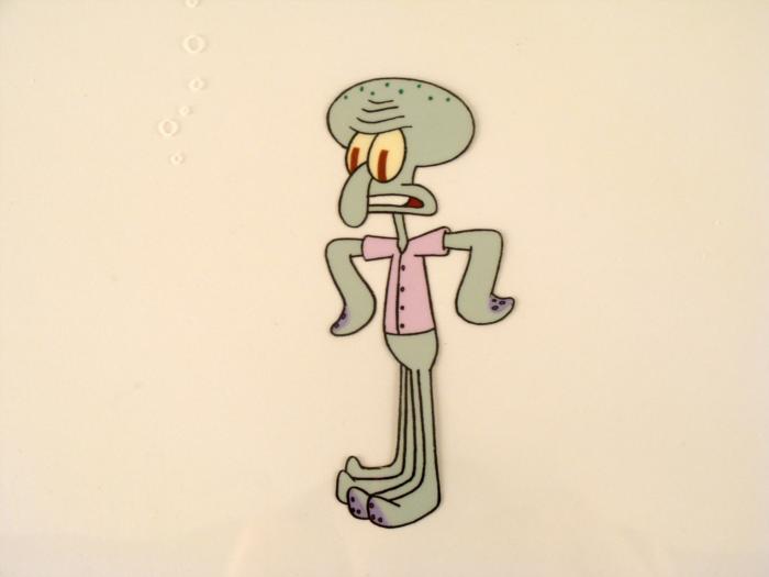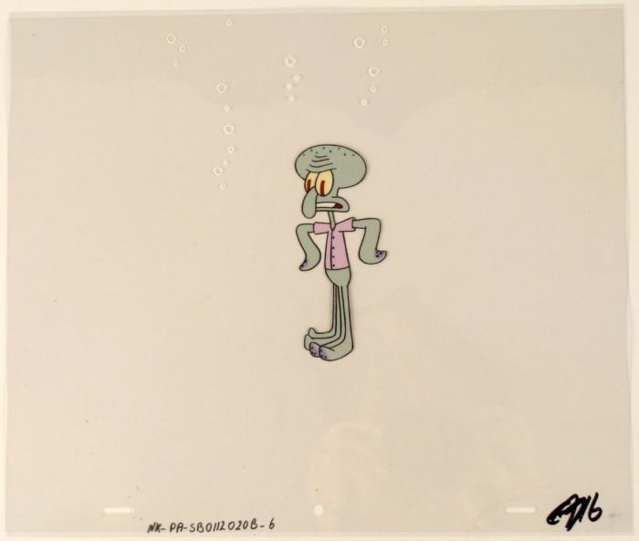 This original animation cel is from the Nickelodeon TV show SpongeBob Squarepants. The story takes place under the deep blue sea in Bikini Bottom, where SpongeBob resides. SpongeBob, who is a yellow, porous sponge, is your typical happy-go-lucky character, as he is always cheerful and enjoys making people laugh. Patrick Star, SpongeBob's neighbor who is a starfish, is your average children's show idiot, as he boasts knowing nothing and is often getting himself into ridiculous situations. Between the homes of these two lies the home of the miserable Squidward, a squid, who is known for being grouchy and playing tricks on SpongeBob and Patrick. Both SpongeBob and Squidward work at the Krusty Krab, a fast food business run by the greedy money-loving Mr. Krabs, a crab, the arch rival of the evil, possibly misunderstood, Plankton. Another neighbor, Sandy Cheeks, an athletic squirrel who normally wears an astronaut's space suit, was introduced in "Tea at the Treedome." She spends most of her time inventing and experimenting. Why is Squidward always in a bad mood?Original Production Animated Cel Overall Size of Cel: 10 1/2" x 12 1/2" Excellent ConditionThis is an original hand-painted cel set-up used in the production of an episode of "SpongeBob SquarePants." Each one-of-a-kind set-up represents a slight change in position of the characters. When individually photographed and projected in rapid succession, the images appear to move.