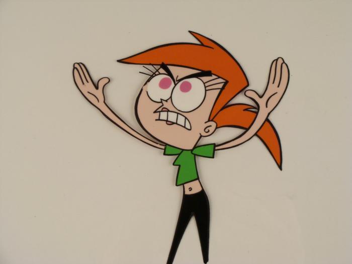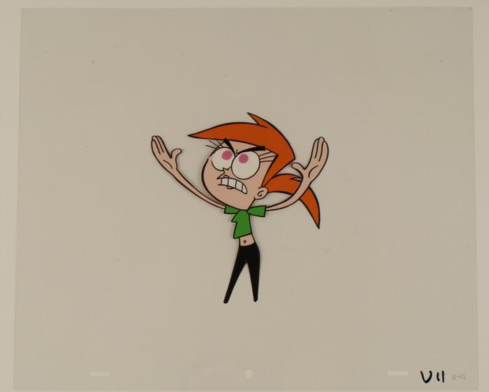 This original animation cel is from the Nickelodeon TV show Fairly Odd Parents. Timmy Turner is a short, buck-toothed 10-year-old boy with a pink cap who lives in Dimmsdale, a small suburban town with his dim-witted parents. His life is constantly miserable, due to the fact that his parents are rarely home and he is babysat by an incredibly evil teenager, Vicky, and that, generally, no one understands him (as indicated by the show's theme song). But everything changes when he receives two fairy parents: Cosmo and his wife, Wanda and later, their son Poof. Timmy learns that his fairy godparents are capable of granting him any wish he wants within certain limits. However, Timmy's immature nature causes him to sometimes ask for wishes that unintentionally result in disaster, and he and his fairy parents and fairy brother must find a way to "unwish" the wish. Here it appears that Timmy's antics has really set Vicky off. Original Production Animated Cel Overall Size of Cel: 10 1/2" x 12 1/2" Excellent ConditionThis is an original hand-painted cel set-up used in the production of an episode of "Fairly Odd Parents." Each one-of-a-kind set-up represents a slight change in position of the characters. When individually photographed and projected in rapid succession, the images appear to move.