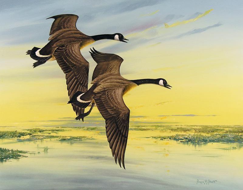 Canadian [1908-2006] CANADA GOOSE PAIR AT SUNRISE; 1963 oil on canvas 22 x 28 in. (55.9 x 71.1 cm) signed & dated