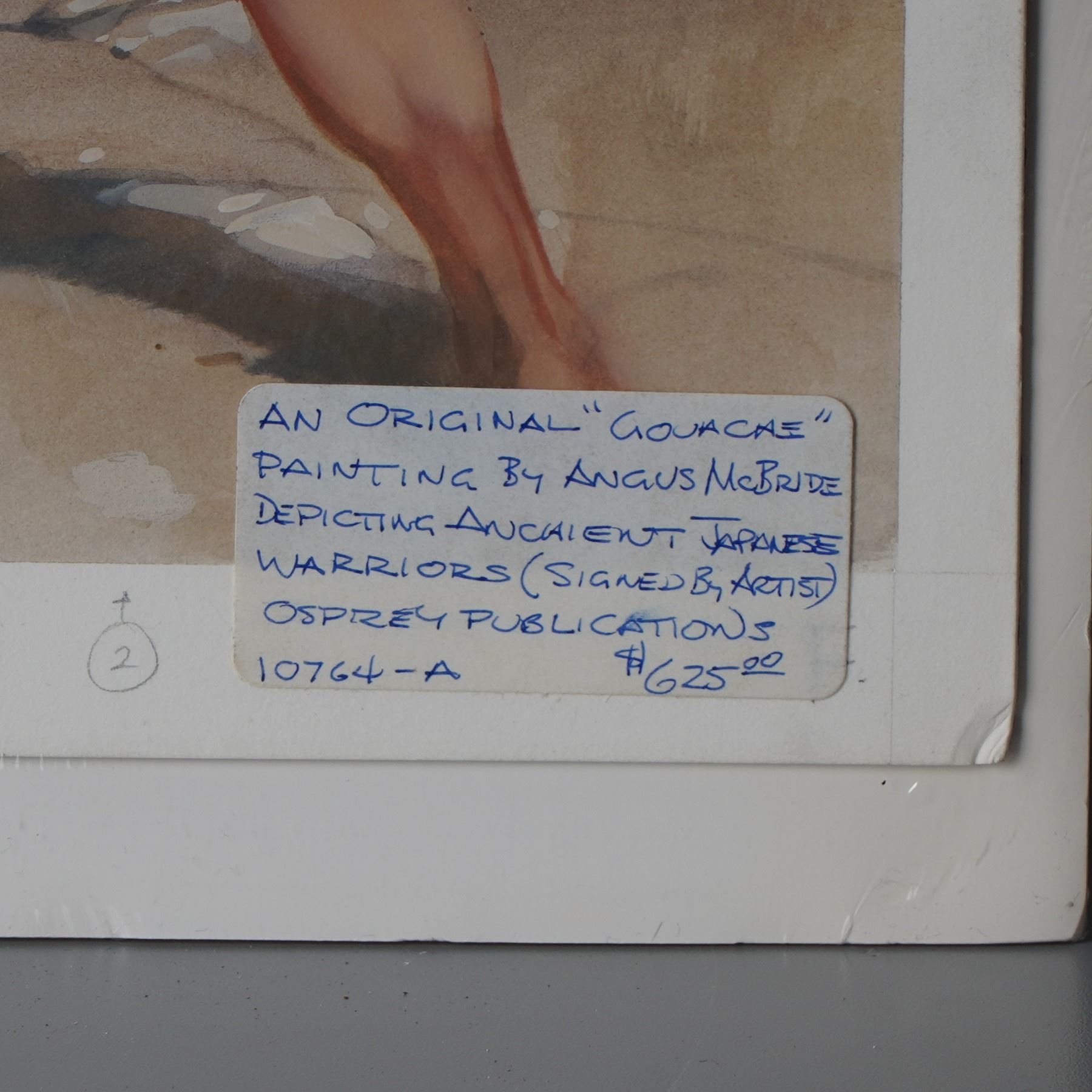 An electrifying original gouache illustration by the acclaimed historical artist Angus McBride, signed lower left, depicting a dramatic confrontation between an ancient Japanese mounted cavalryman and a tribal axe-wielding warrior. This masterful composition radiates tension and energy, capturing the instant before impact with extraordinary dynamism and anatomical precision. Characterized by McBride's signature style of rich detail and vibrant color, this work exemplifies his career-defining ability to bring ancient warfare to life. Produced for Osprey Publishing and bearing the artist's signature, this painting is a prime example of McBride's storytelling prowess in the military and historical illustration world.
