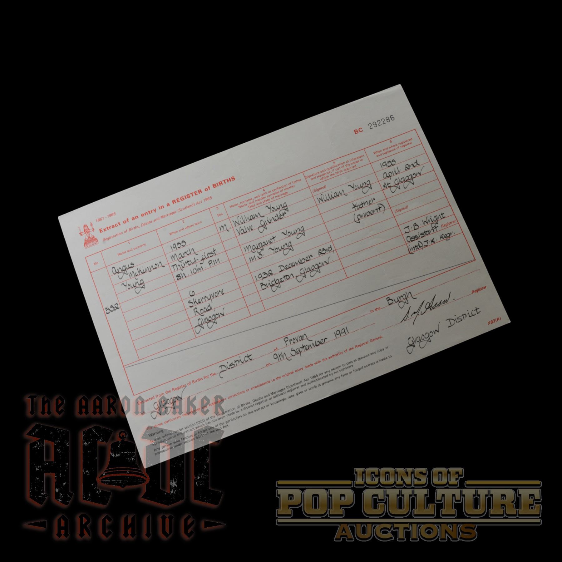 Presented here is a certified copy of the birth certificate for legendary AC/DC lead guitarist Angus McKinnon Young. Measuring approximately 11.75 inches by 8.25 inches, this official Scottish registry document records Young’s birth on March 31, 1955, in Glasgow, Scotland, including his full name, parental details, and family residence at the time. Issued in the District of Provan on September 9, 1991, the certificate features the official red-ink printed format of the General Register Office, along with the registrar’s signature. A rare and historically significant document, it offers a direct connection to the early life of one of rock’s most electrifying performers and a cornerstone figure in AC/DC’s enduring legacy.