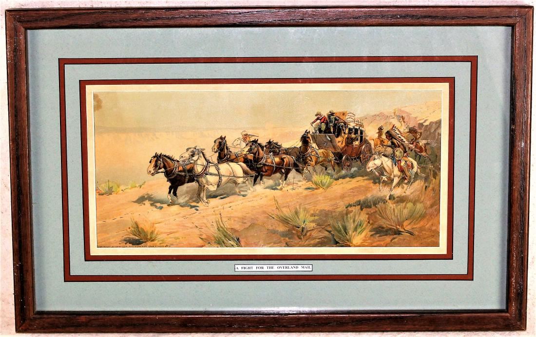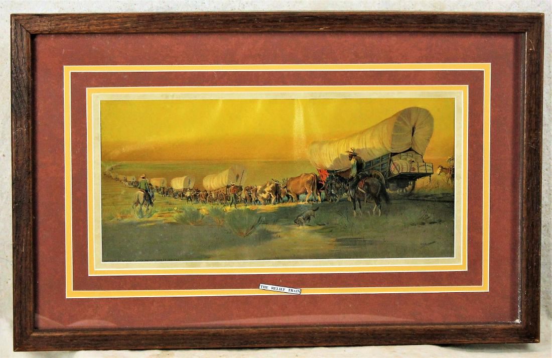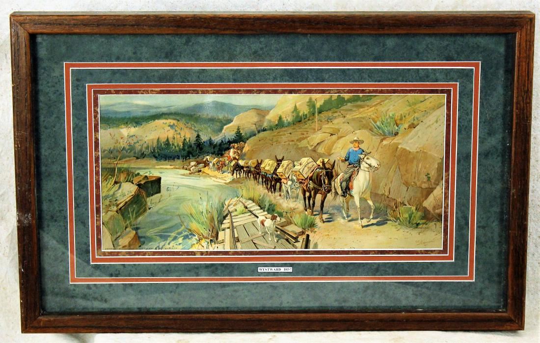 Grouping of three framed western pictures depicting scenes of settling the West, with Anheiser Busch advertising used cleverly in the images. Each image measuring 8"x 16".