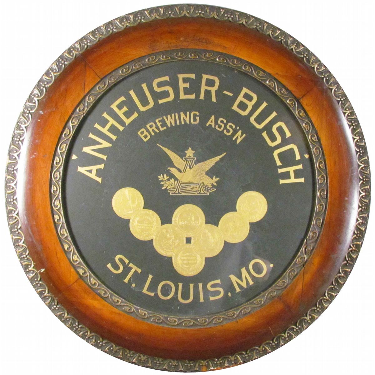 Anheuser-Busch Brewing Ass'n Reverse Glass Sign in original gesso frame. Excellent condition. 25 1/4 inch diameter.