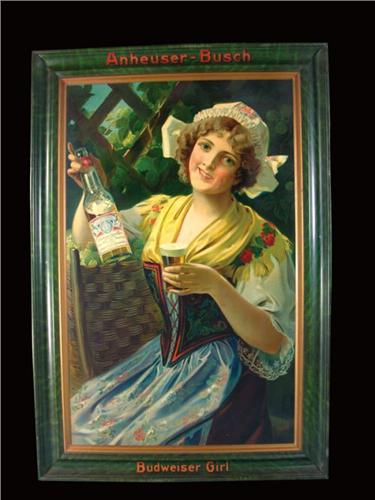 Anheuser Busch Budweiser Girl Self Framed Tin Sign. This is a very rare sign with a beautiful girl touting one of the best brews in the world. Great colors. Minor restoration to cheek otherwise excellent condition. 26 X 38 inches.