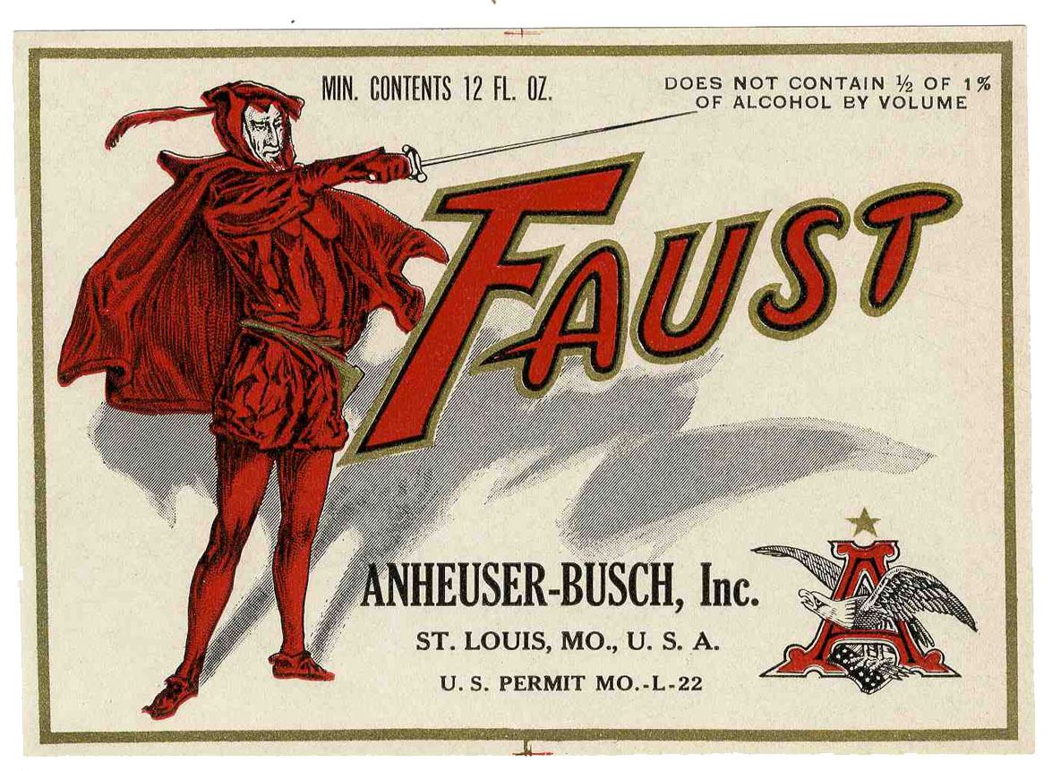 Label from Anheuser-Busch's Faust brand, produced during Prohibition. Top of label reads ''Does Not Contain 1/2 of 1% Of Alcohol By Volume''. Features image a swordsman dressed in red beside text ''Faust / Anheuser-Busch Inc. / St. Louis U.S.A. / U.S. Permit MO. - L - 22.'' Label measures 4.75'' x 3.25''. Near fine condition.