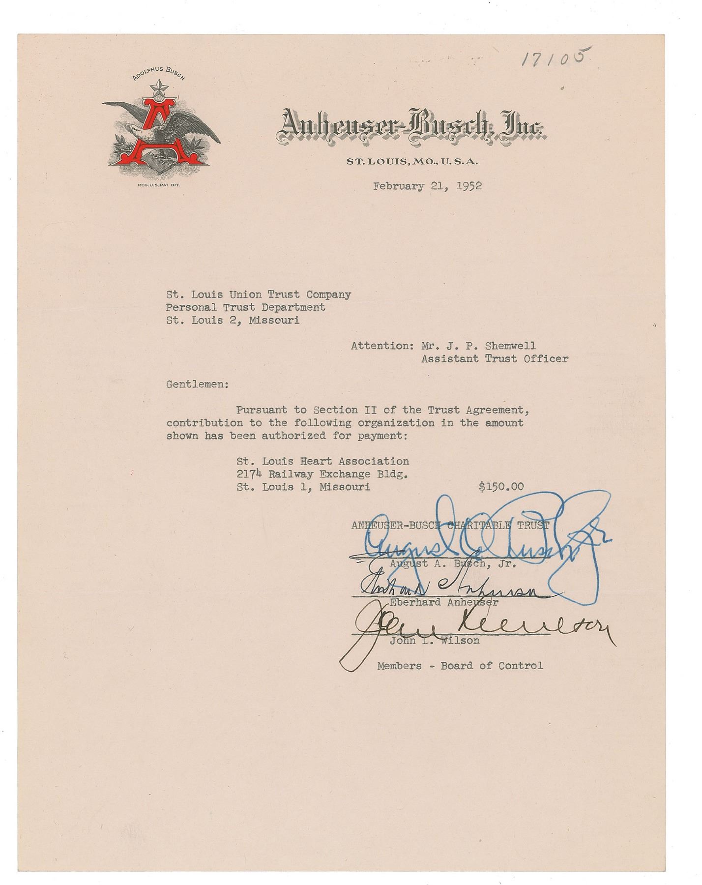 DS, one page, 8.5 x 11, Anheuser-Busch letterhead, February 21, 1952. Document submitted to the St. Louis Union Trust Company, in part: "Pursuant to Section II of the Trust Agreement, contribution to the following organization in the amount shown has been authorized for payment: St. Louis Heart Association…$150.00." Signed at the conclusion by board members August A. Busch, Jr. (commonly known as Gussie Busch, remembered for owning the St. Louis Cardinals), Eberhard Anheuser, and John L. Wilson. In fine condition.