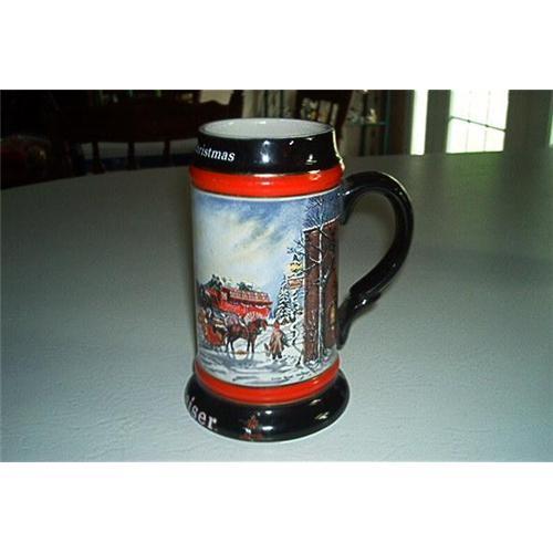 This beer stein measures 7 inches tall and 11 inches in diameter. Advertising Anheuser-bush-Budweiser Beer. Design shows: "A Perfect Christmas" Major colors are red, black and white with gold trim. It shows the Clydesdale Horses pulling a red wagon with Budweiser Anheuser-Bush on the side of the wagon. A snow scene, old lanterns lit-up and houses decorated for Christmas. Applied black Handle trimmed in gold. Base of the stein has Budweiser in big bold letters. The bottom of the stein states: Handcrated for Anheuser-Bush,Inc; 1992 Collectors Series; "A Perfect Christmas"; The World Famous Budweiser Clydesdales 8-horse Hitch and Wagon Rendered by Artist Susan Sampson. Made in Brazil by Ceramarte.