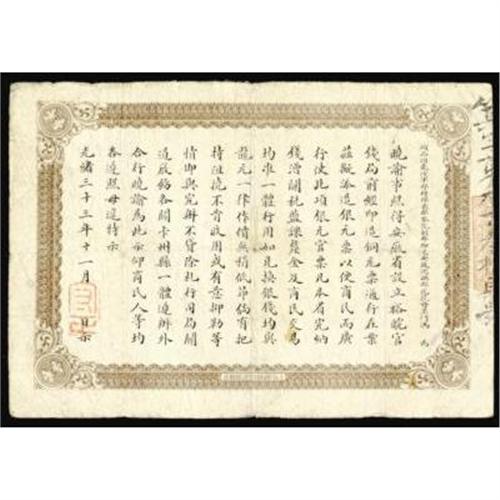 <style type="text/css"> body, td, th { font-family: Arial, Helvetica, sans-serif; font-size: 12px; color: #482424; margin: 0px; padding: 0px; } #header { background-image: url(http://www.bowersandmerena.com/ebay/images/template_v3_01.gif); clear: both; background-color: #590303; border-top-width: 2px; border-top-style: solid; border-top-color: #B38C4F; } #header #header_wrapper { height: 75px; clear: both; width: 800px; margin-right: auto; margin-left: auto; background-image: url(http://www.bowersandmerena.com/ebay/images/template_v3_03.gif); background-repeat: no-repeat; background-position: right; color: #F3EDCC; } #header #header_wrapper #header_logo { float: left; height: 75px; width: 444px; background-image: url(http://www.bowersandmerena.com/ebay/images/template_v3_02.gif); background-repeat: no-repeat; font-size: 10px; text-transform: capitalize; color: #B38C4F; } #header #header_wrapper #header_right { float: left; height: 75px; width: 356px; text-align: right; } #header #header_wrapper #header_right #headerLoginBtn { margin-bottom: 30px; } #header #header_wrapper #header_right input#txtSearch { color: #B49056; border: 1px solid #B49056; width: 175px; padding-top: 3px; padding-right: 3px; padding-bottom: 4px; padding-left: 3px; } #nav { height: 37px; background-image: url(http://www.bowersandmerena.com/ebay/images/template_v3_05.gif); clear: both; } #nav #nav_wrapper { height: 35px; width: 800px; margin-right: auto; margin-left: auto; border-left-width: 1px; border-left-style: solid; border-left-color: #B38C4F; } #nav #nav_wrapper a { padding-right: 15px; padding-left: 15px; border-right-width: 1px; border-right-style: solid; border-right-color: #B38C4F; height: 25px; padding-top: 10px; display: block; float: left; text-decoration: none; font-weight: bold; color: #5D0303; } #nav #nav_wrapper a:hover { color: #B38C4F; } #nav #nav_wrapper #search { float: right; padding-top: 7px; } #nav #nav_wrapper #search #txtSearch { font-family: Arial, Helvetica, sans-serif; font-size: 10px; text-transform: uppercase; color: #D2AE75; border: 1px solid #B38C4F; padding: 3px; } #content_bgd { background-image: url(http://www.bowersandmerena.com/ebay/images/template_v3_09.gif); background-repeat: repeat-y; background-position: center; padding-top: 15px; padding-bottom: 15px; background-color: #FBFBDB; } #content_wrapper { clear: both; height: auto; width: 800px; margin-right: auto; margin-left: auto; } .LotDetailWhite { line-height:normal; font-size:13px; font-family: arial,helvetica,sans-serif; color: White; font-weight: bold; } .LotDetailInformation { line-height:normal; font-size: 13px; font-family: arial,helvetica,sans-serif; } .LotDetailMessage { line-height:normal; font-size: 13px; font-family: arial,helvetica,sans-serif; color: red; } } tr.HeaderAuctionTitle td { color: #000000; font-weight: bold; padding: 2px; background-image: url(http://www.bowersandmerena.com/ebay/images/template_v3_05.gif); background-repeat: repeat-x; border-bottom-width: 1px; border-bottom-style: solid; border-bottom-color: #B38C4F; } table.AuctionSummary a, table.AuctionSummary a:link, table.AuctionSummary a:visited { color: #0000FF; text-decoration: none; } } td.tableHeaderLeft { border-left-width: 1px; border-left-style: solid; border-left-color: #B38C4F; } td.tableHeaderRight { border-right-width: 1px; border-right-style: solid; border-right-color: #B38C4F; } td.tableCellMiddle { border-left-width: 1px; border-left-style: solid; border-left-color: #B38C4F; border-right-width: 1px; border-right-style: solid; border-right-color: #B38C4F; padding: 5px; } tr.footer td { border-top-width: 1px; border-top-style: solid; border-top-color: #B38C4F; } </style> </head> <body> <div id="header"> <div id="header_wrapper"> <div id="header_logo"> </div> <div id="header_right"> </div> </div> </div> <div id="nav"> <div id="nav_wrapper"> <a href="http://www.bowersandmerena.com">Our eBayLive Auctions</a> <a href="#PaymentInfo">Payment Information</a> <a href="#ShippingInfo">Shipping Information</a> <a href="#About">About Bowers and Merena</a> </div> </div> <div id="content_bgd"> <div id="content_wrapper"> <table width="100%" border="0" cellpadding="5" cellspacing="0" class="AuctionSummary"> <tbody> <tr class="HeaderAuctionTitle" style="height: 25px;"> <td align="left" class="tableHeaderLeft" > </td> <td align="center" class="tableHeaderRight"> <span style="font-size: large;">Lot #525. Provincial Banks. Anhwei Yu Huan Bank, 1907 Dollar Issue.</span> </td> </tr> <tr> <td colspan="3" class="tableCellMiddle"> 1907, $1, P-S819, VG+ condition, dragon dollars, left & right with border dragons.