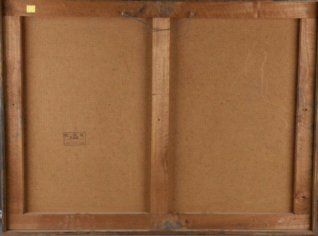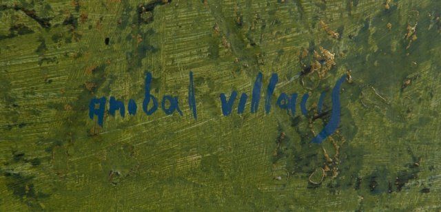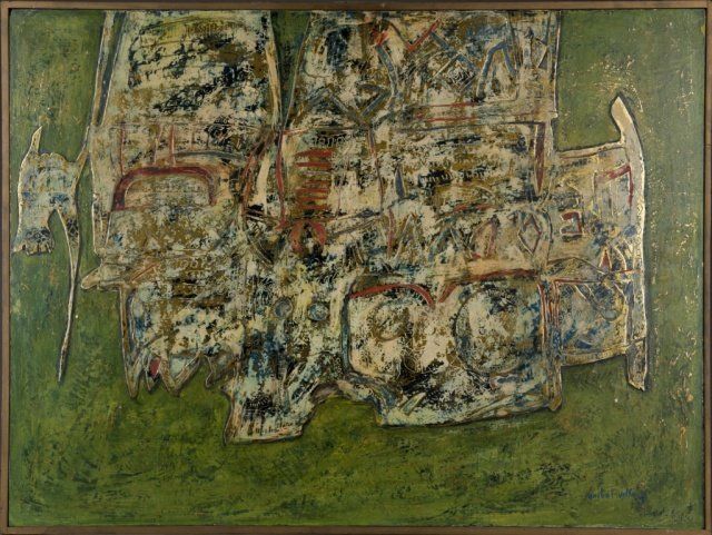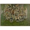 Villacis, Anibal (Ecuador, b. 1927). Green, gilt, and red abstract composition. Signed at l.r., "Anibal Villacis". In painted wood frame. 23 1/2" x 31 1/4". Frame: 24 1/4" x 32".