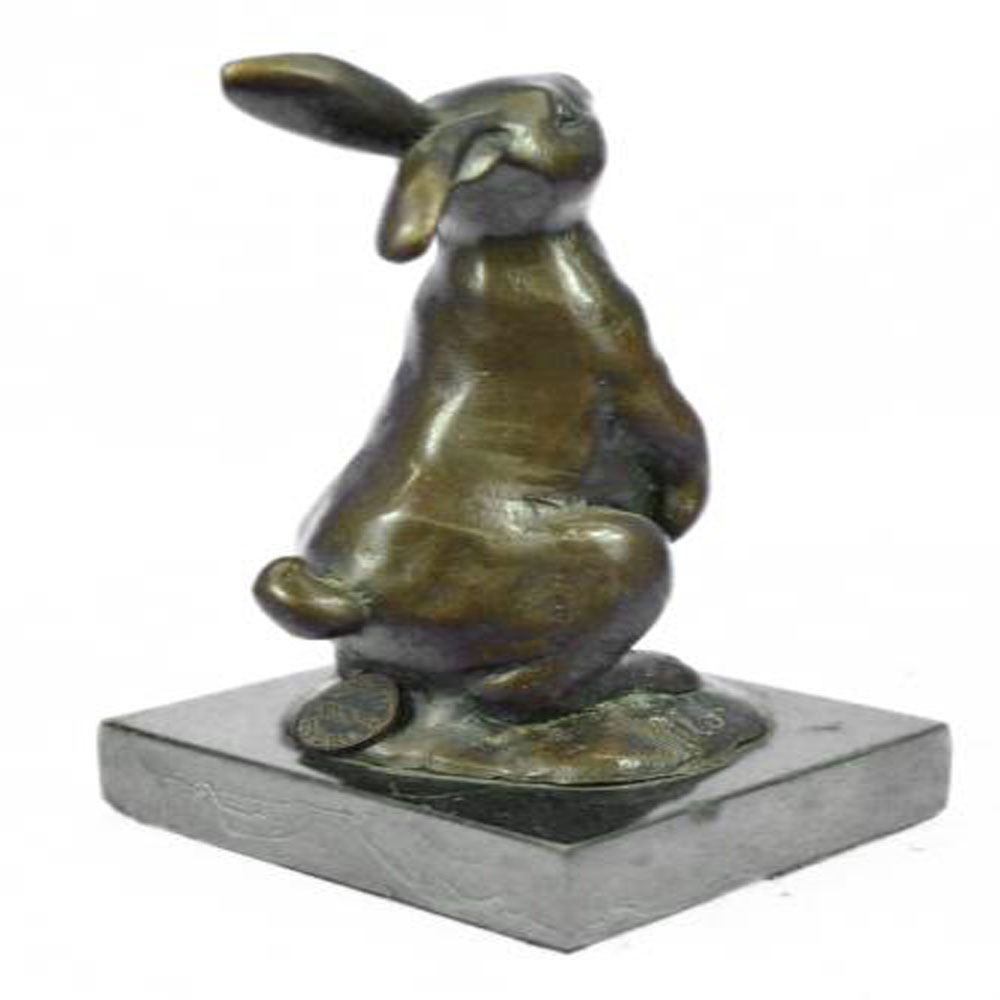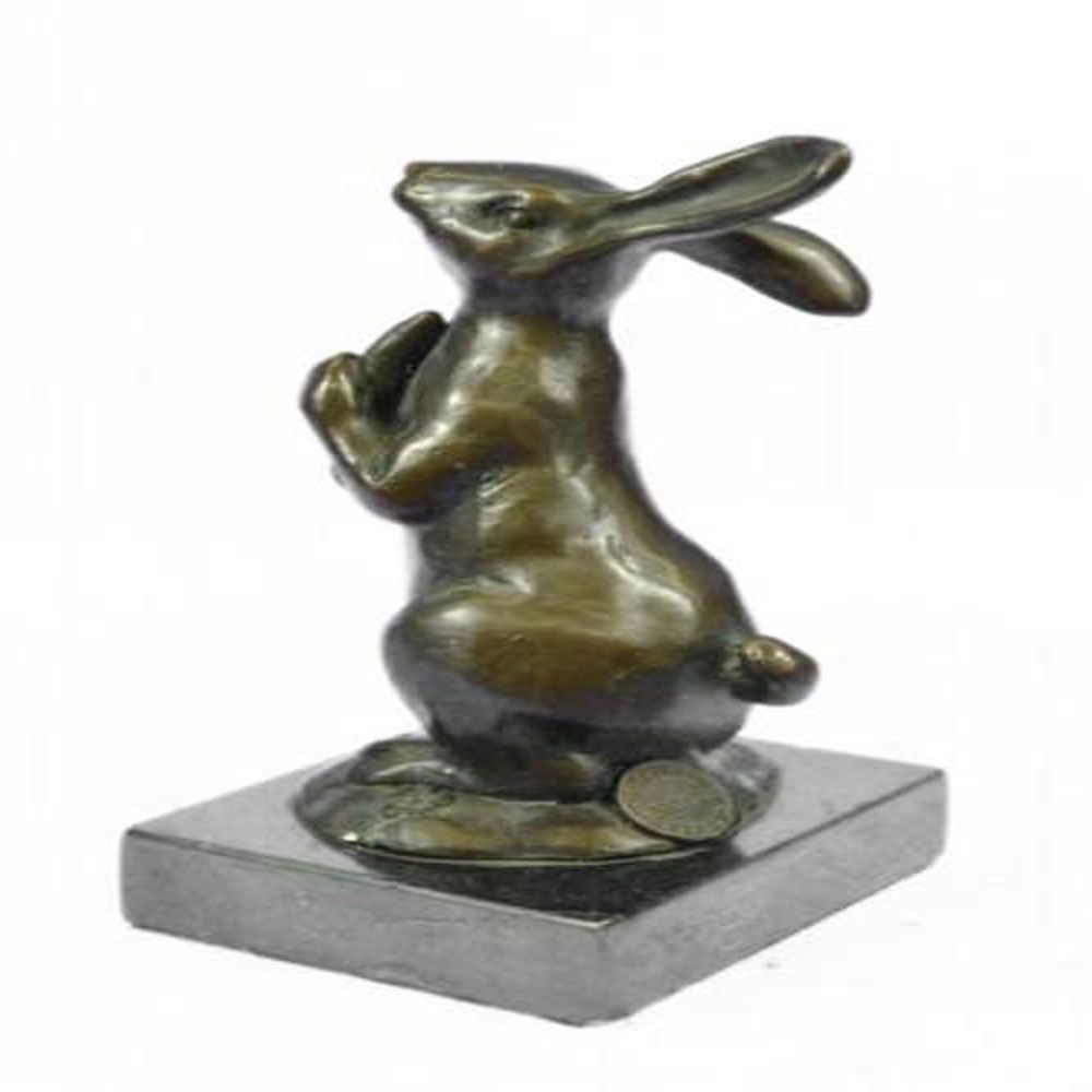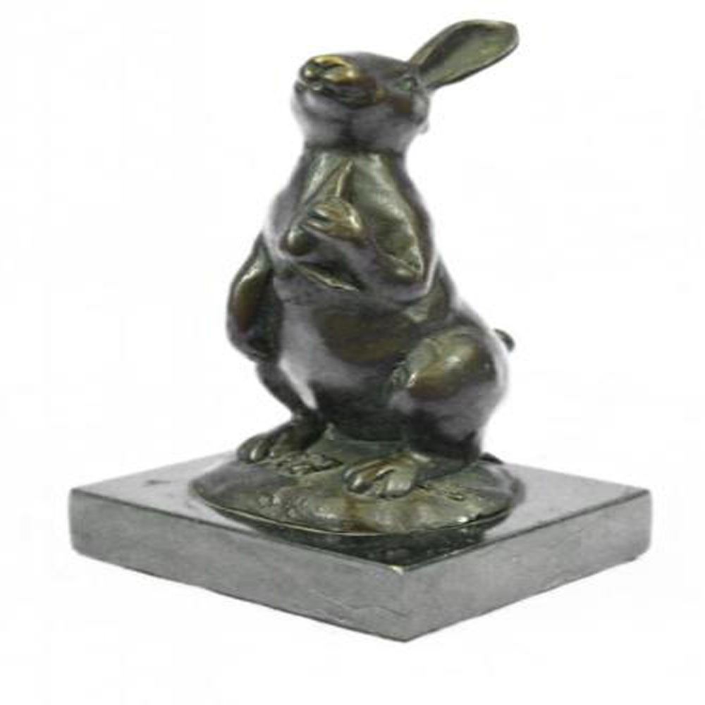 This cute bunny looks up with the sweetest look and holds a carrot in his tiny arms. This little rabbit is the perfect touch of decor for a sweet and loving home. His ears are long and he stands on his legs while looking up with full attention. His facial features are great giving him character and capturing a lovely and innocent look. This is a perfect gift to give around spring time and Easter. This sculpture was cast using the Lost Wax Method and has a two tone brown patina and is mounted on a marble base. Bronze Dimensions with Marble Base: Height 6 X Width 3 inches. Weight: 3 LBS.