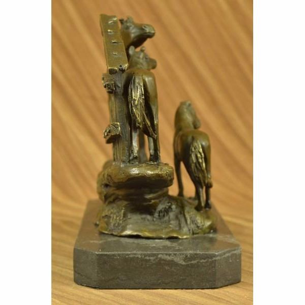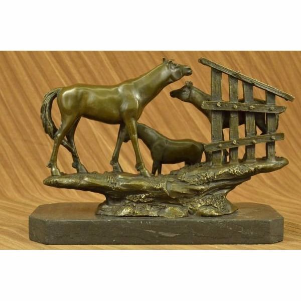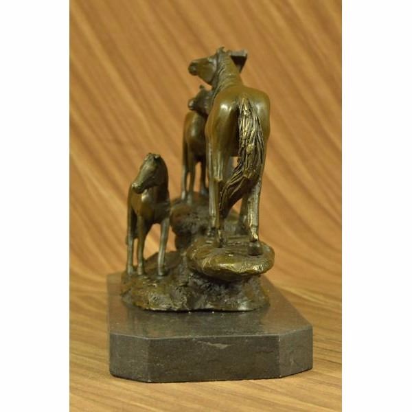 This lovely sculpture depicts a beautiful mare and foal pair of horses standing side by side along the pasture. The female horse slightly turns her head back as she gazes at her mare. These Thoroughbred horses are amazing creatures. The artist of this hand crafted bronze sculpture has captured the exquisite beauty of these lovely creatures. They gallop freely in the open land, feeling the moist soil beneath their hooves. This beautiful sculpture would make a great gift for the horse enthusiast in your life. Sculpture is hand made using the œLost Wax Method and made of 100% bronze. A two toned brown patina is used and he rests on a solid black marble base. Bronze Dimensions with Marble Base: Height 8 X Width 12 inches. Weight: 14 LBS. Please Note: This is a reproduction bronze sculpture from the original molded and signed. This featured bronze sculpture is a recast after the original, and has been done recently. This 100% bronze sculpture is an abstract piece certain to be a conversation piece.