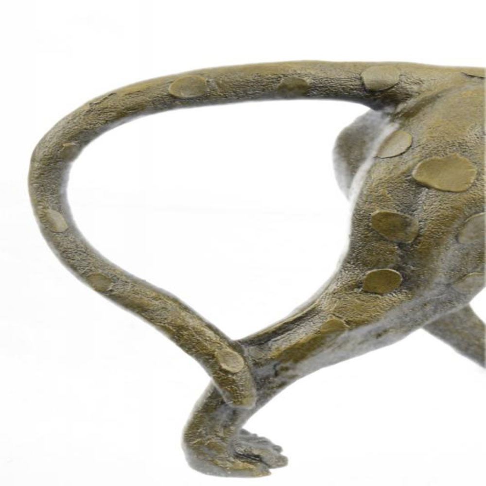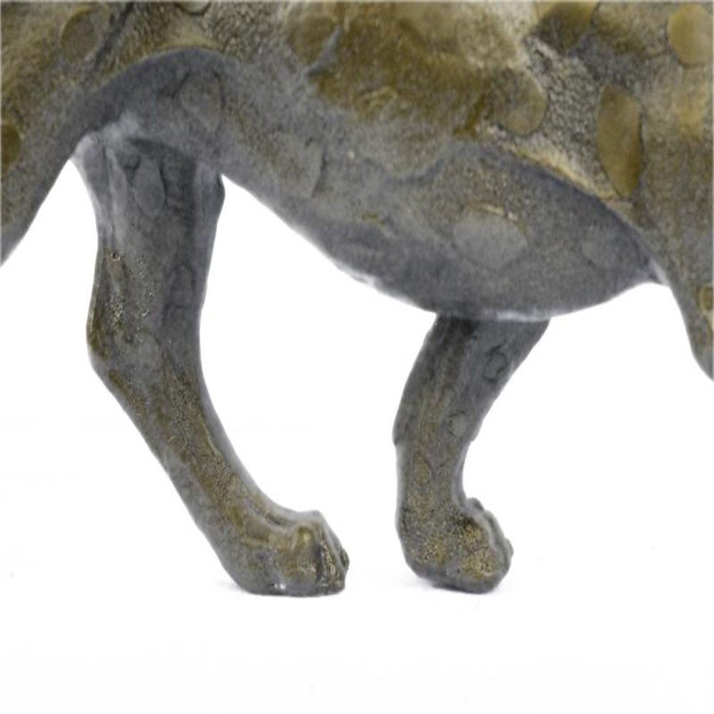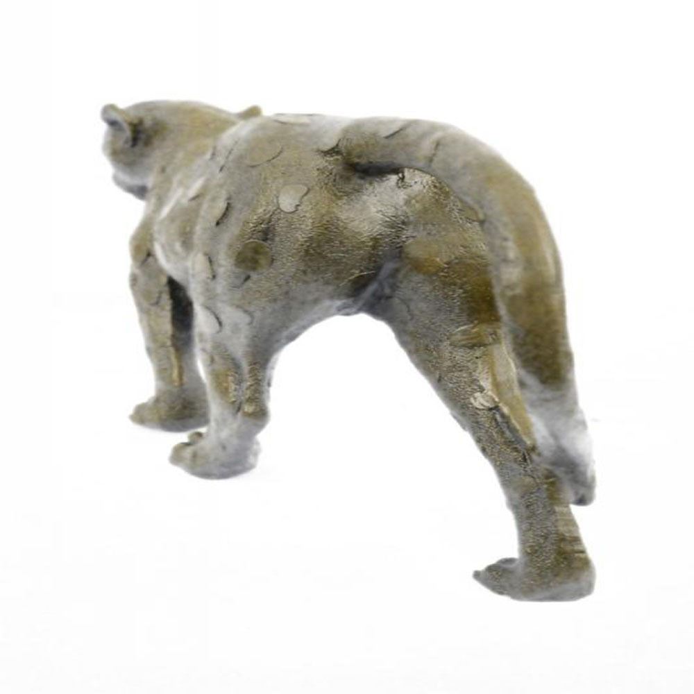 Her muscles flex as she walks across the open fields. This Sculpture draws you in to the action and lets your imagination run wild as you join her on her walk across the wide open plains of the outdoors. This amazingly detailed Sculpture portrays the Cougar stride beautifully as she transitions her paw and her weight while walking. Her facial expression shows calm, cool, and playful as she paws at the ground.A suiting soft brown patina highlights the muscles on the tigers legs, paws, head. The head of the tiger is beautifully detailed right down the shape of the skull, jaw line, ears and facial structure. This Bronze Sculpture was castes using the Lost was Method. This Sleek and Graceful piece is perfect for the wildlife lover in you. Bronze Dimensions: Height 7 X Width 16 inches. Weight: 9 LBS.