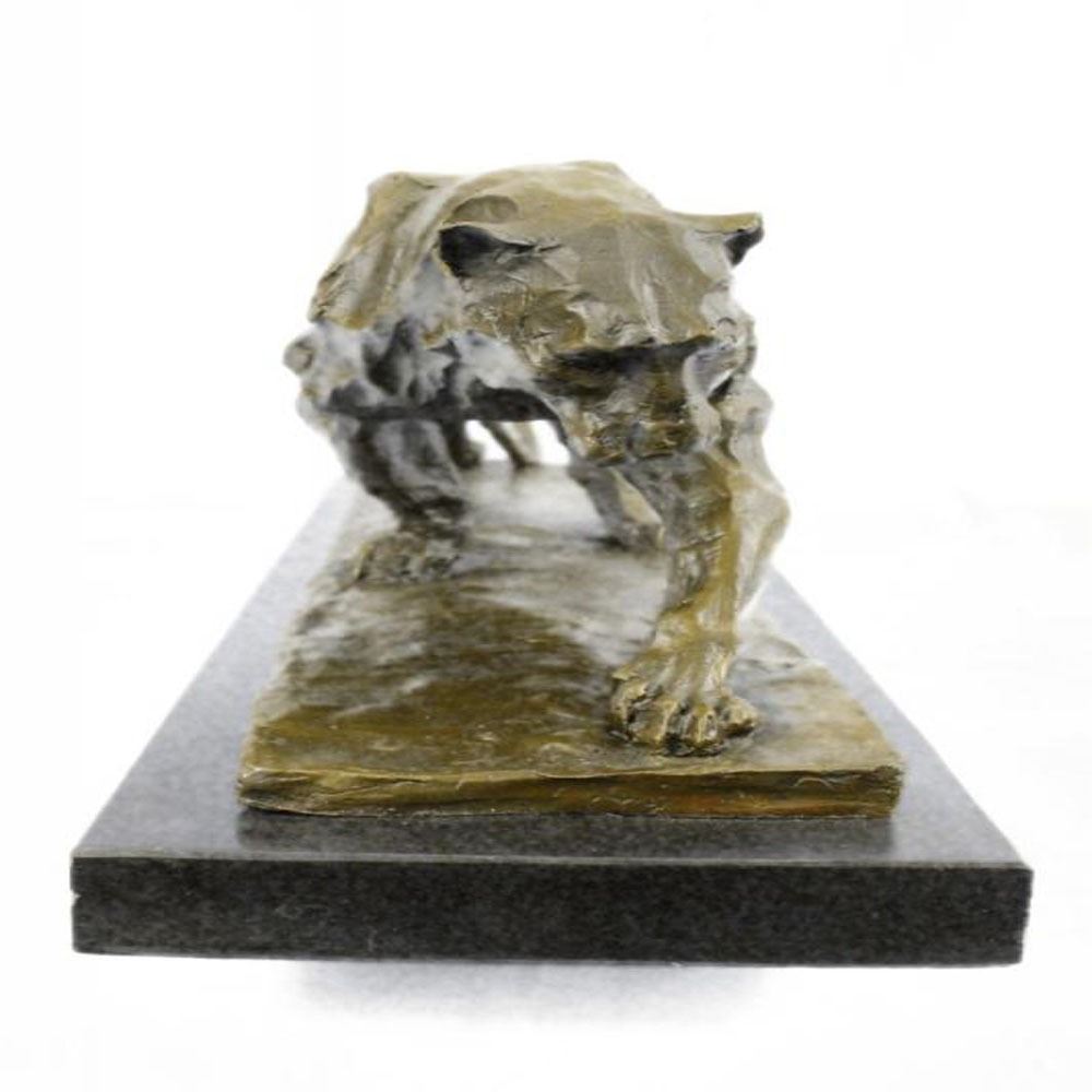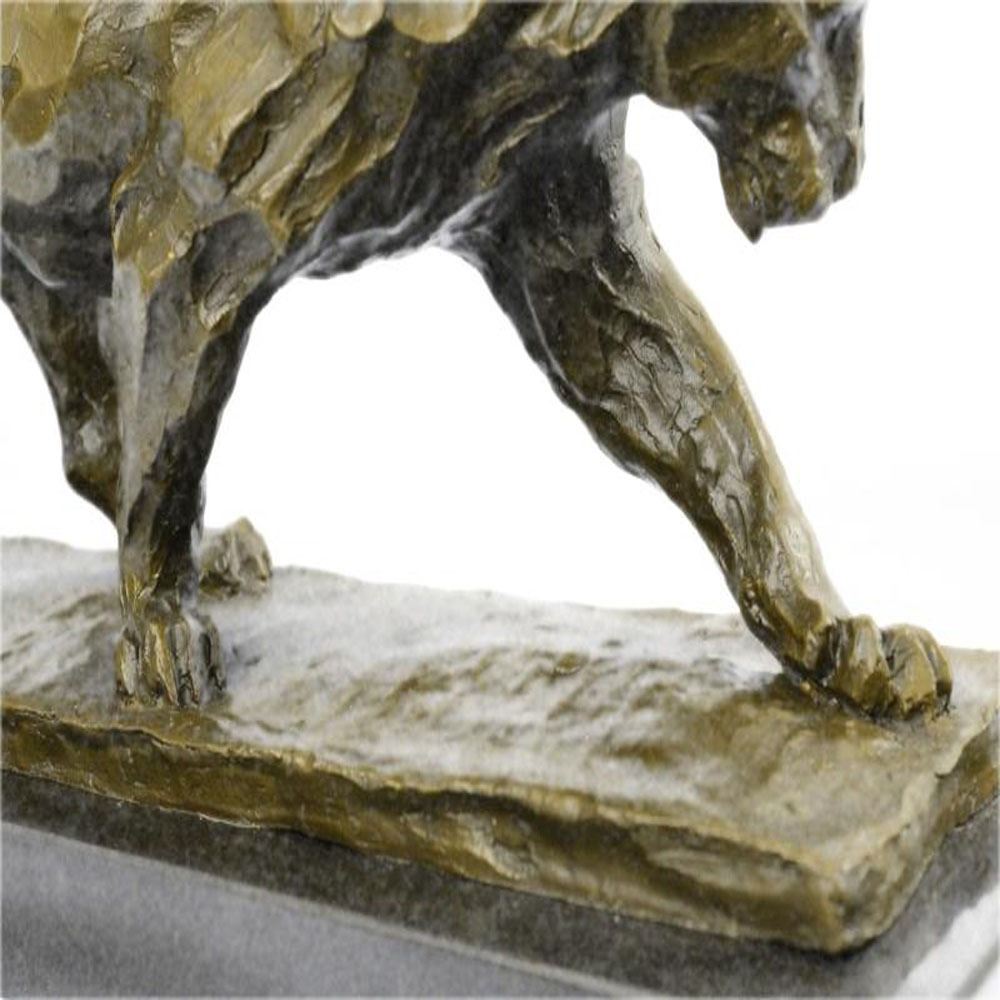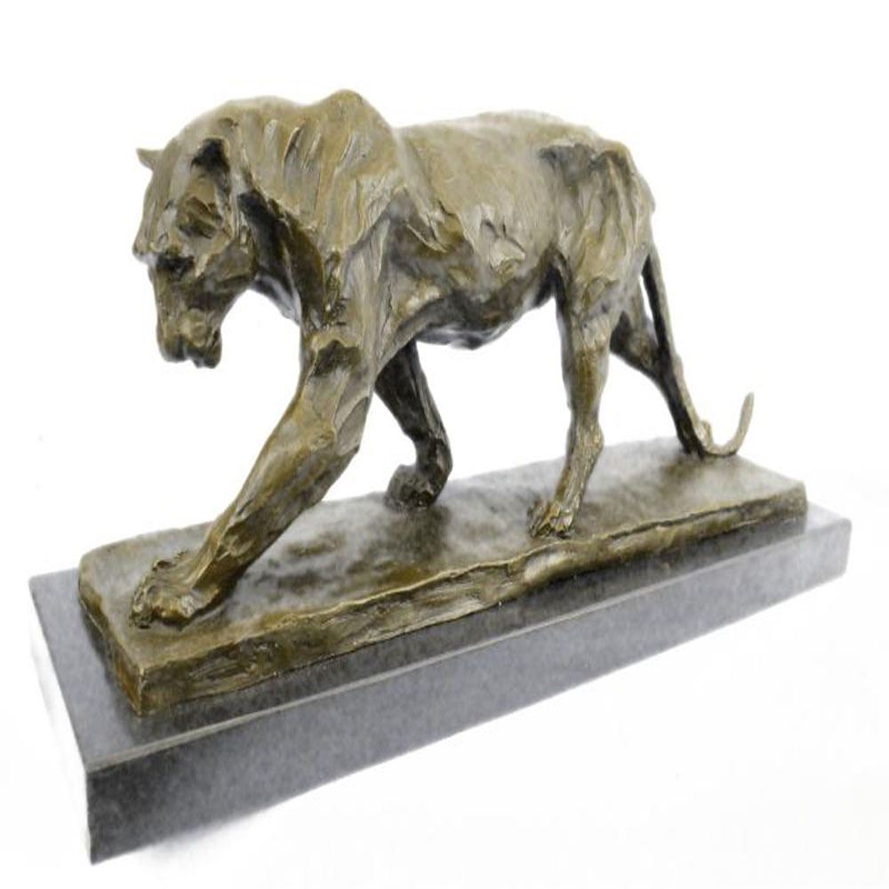 A lioness wanders through her wild African habitat after chasing away a predator from her cubs. She is fierce yet nurturing, ready to fight to the death to protect herself or her young. The deep carving of this sculpture are a tribute to the rugged strength lions possess. She appears somber here, adopting a slow pace and representing a duality of strength and calmness. This 100% bronze piece was cast using the lost wax method. Bronze Dimensions with Marble Base: Height 9 X Width 20 inches. Weight: 32 LBS.