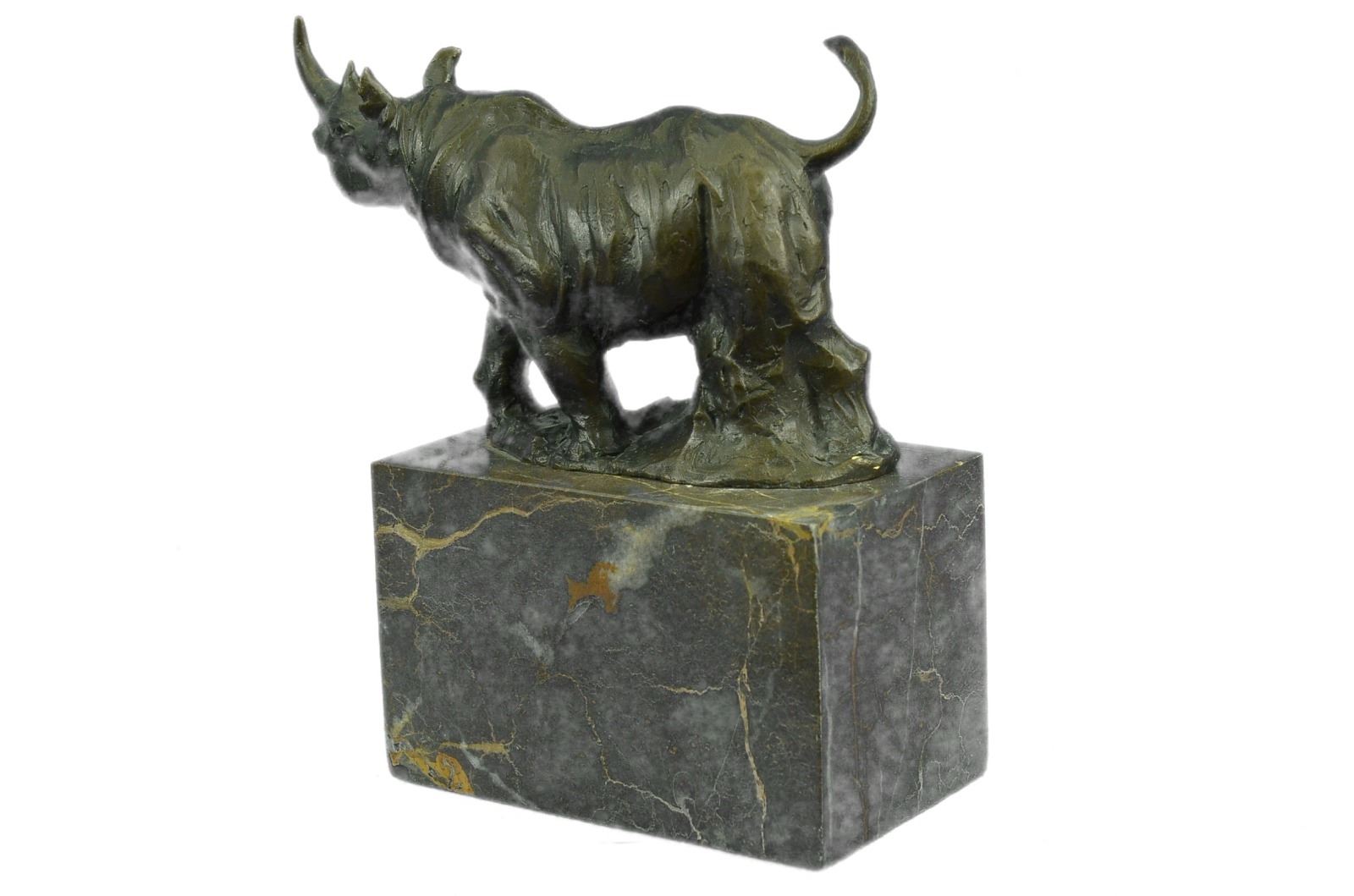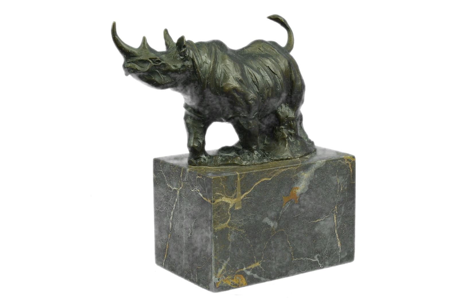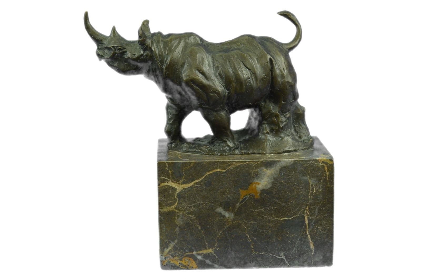 This rhino stands with his nose high in the air and his legs are planted on the ground with an immoveable stance.Rhinos are known for using body language to communicate. Typically rhinos never lift their heads from walking, trotting or grazing. Rhinoceros keep their heads down in the same position and will only raise it when they become alarmed. They are able to maintain speeds of 25 miles per hour over short distances and they are surprisingly agile. They also use Vocalizations to communicate as well. This bronze sculpture depicts an alarmed rhino. His ears are up right and forward on the alert of any strange noises and his head high in the air checking out his surrounding and ready to charge at any moment. This bronze portrays great lifelike qualities such as the proportions right down to the elongated head and the horns, one horn in front and a shorter one behind. The skin is thick and prominently folded on the front of the shoulders and on the upper part of the hind limbs. His massive feet sports 3 toes on each and has great detail. This bronze sculpture was cast using the Lost Wax Method ensuring quality of detail. Bronze Dimensions with Marble Base: Height 8 X Width 8 inches. Weight: 8 LBS. Inventory: 14K2852641