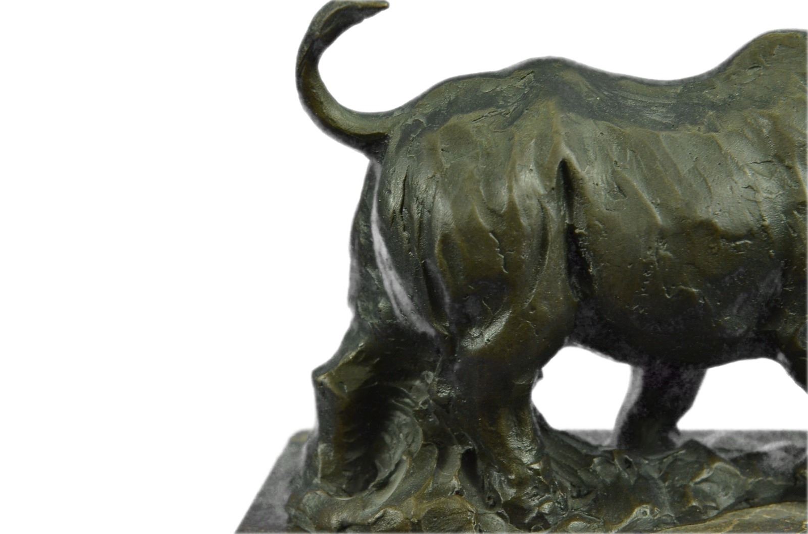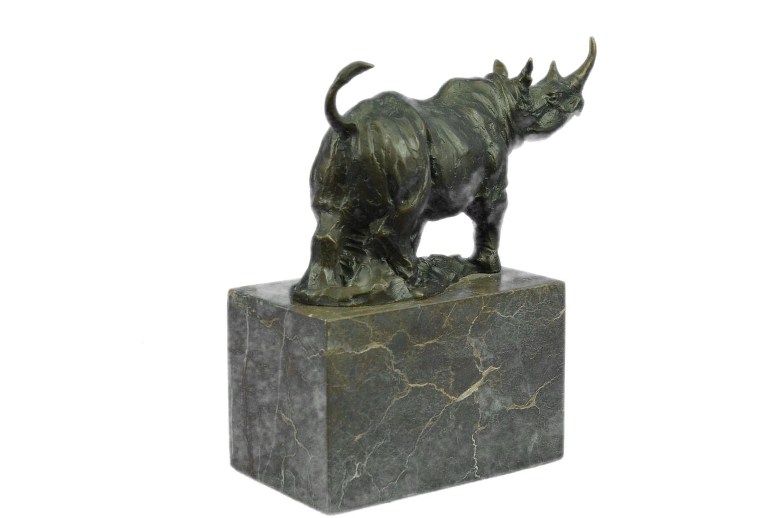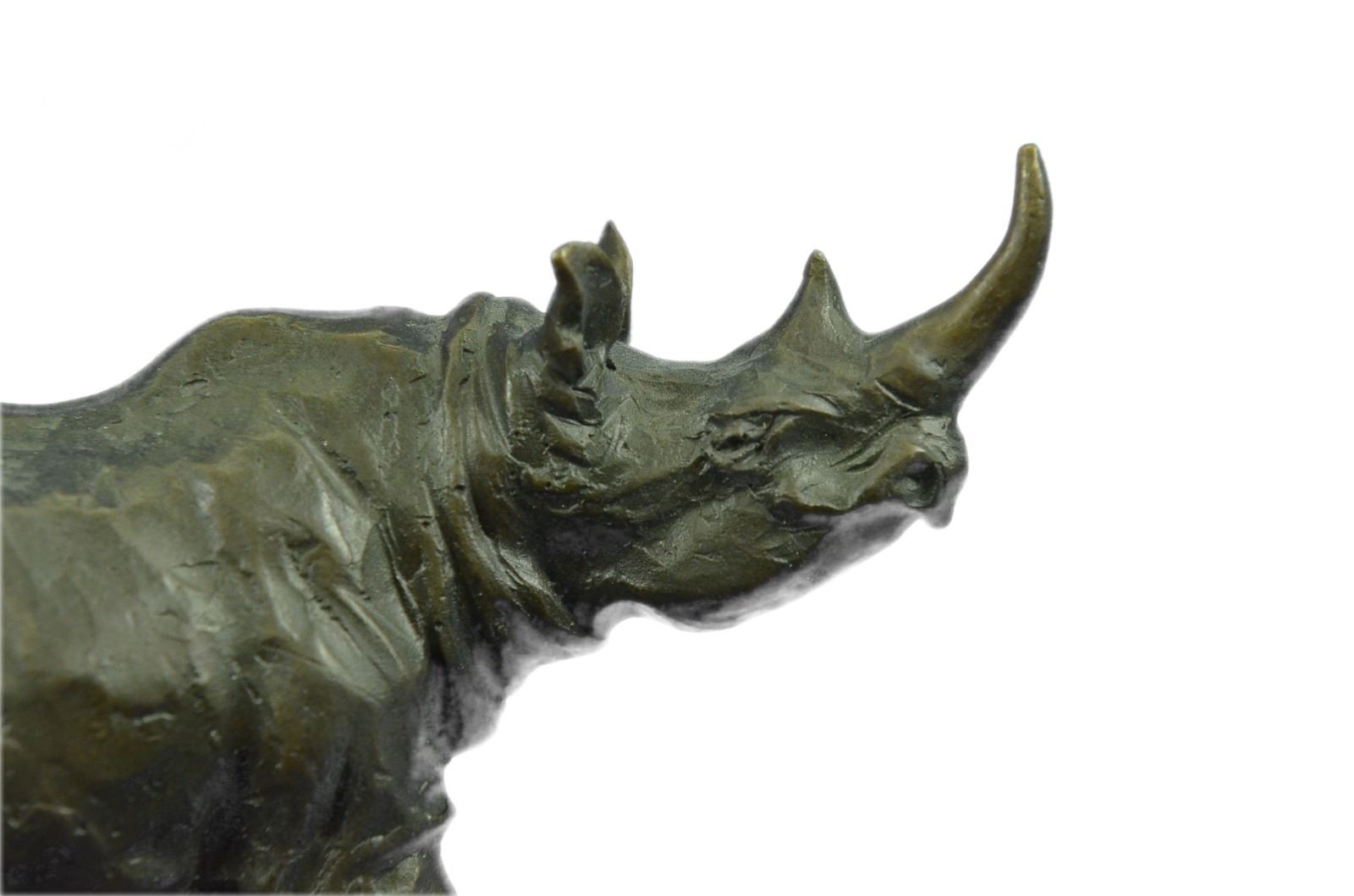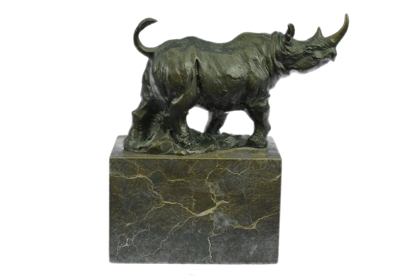 This rhino stands with his nose high in the air and his legs are planted on the ground with an immoveable stance.Rhinos are known for using body language to communicate. Typically rhinos never lift their heads from walking, trotting or grazing. Rhinoceros keep their heads down in the same position and will only raise it when they become alarmed. They are able to maintain speeds of 25 miles per hour over short distances and they are surprisingly agile. They also use Vocalizations to communicate as well. This bronze sculpture depicts an alarmed rhino. His ears are up right and forward on the alert of any strange noises and his head high in the air checking out his surrounding and ready to charge at any moment. This bronze portrays great lifelike qualities such as the proportions right down to the elongated head and the horns, one horn in front and a shorter one behind. The skin is thick and prominently folded on the front of the shoulders and on the upper part of the hind limbs. His massive feet sports 3 toes on each and has great detail. This bronze sculpture was cast using the Lost Wax Method ensuring quality of detail. Bronze Dimensions with Marble Base: Height 8 X Width 8 inches. Weight: 8 LBS. Inventory: 14K2852641