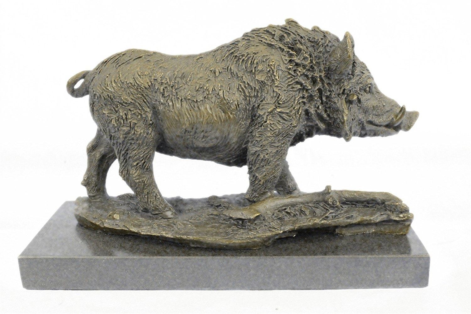 The wild boar looks out at the beholder free and defiant coming out of the forest's edge to forage for food in the late afternoon. From head to tail, his attitude demonstrates a bold alertness to his surroundings. Exquisite detail went into the texture of the fur which is usually a combination of stiff bristles and fine fur. His tucks, that continuously grow. In Celtic belief, symbolizes warrior spirit, courage, leadership and direction. He is strong, dangerous, intrepid and difficult to kill. Boar meets enemies with nobility and courage, signifying bravery and perseverance. Hes a fierce fighter, refusing to yield. The 100% handmade bronze sculpture was captured using the ancient method of lostwax casting and stained with a brown patina finish for preservation. It is mounted upon a black marble base. Bronze Dimensions with Marble Base: Height 8 X Width 11 inches. Weight: 12 LBS. Inventory: 49YDW0505994