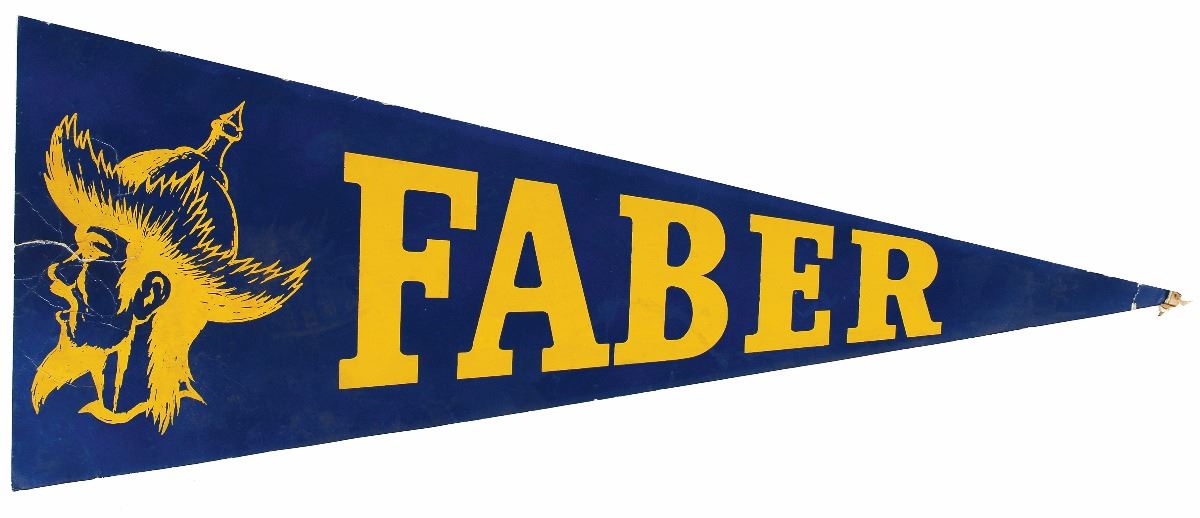Rare original color cardstock prop pennant used in Animal House, measuring 27.5 x 11.5, reading “Faber” in yellow lettering on a blue background, with the logo on the left. In very good condition, with significant wear to the tip, noticeable creasing to the left side, and a large tear to the left edge. Originates from the estate of Saul Kahan, the unit publicist for director John Landis who worked on Animal House, The Blues Brothers, Blade Runner, Three Amigos, and other classics. As a piece with direct relation to the fictional ‘Faber College’ setting of the iconic comedy, this is an extraordinary piece of pop cultural history.