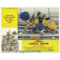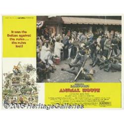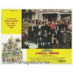 <B>Animal House (Universal, 1978)</B></I> Lobby Card Set of 4 (11" X 14"). Director John Landis led John Belushi in his breakout role as the boys of Delta House took on Dean Wormer and the rest of the establishment. Tim Matheson, Peter Riegert, Tom Hulce and Belushi took comedy to a new low and inspired toga parties along the way! Offered in this lot is the entire lobby set of four cards, as this was how Universal released these cards from this comic classic. There are light surface creases and small corner bumps, otherwise fine. Very Fine-. 4 items