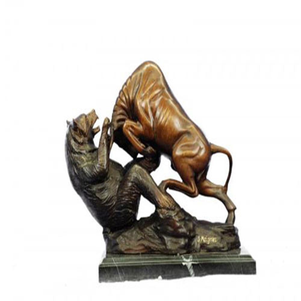 A fierce battle has broken out between two known killers. Bull vs. Grizzly bear. The bull charges its horns in and the bear locks his massive paws over its head, pulling him into his plump body. The bear snarls and roars. Two massive killers in their own food chain circle, no one knows how these two crossed deadly paths. This bronze sculpture was cast using the Lost wax Method and it is mounted on marble base. Bronze Dimensions with Marble Base: Height 10 X Width 13 inches. Weight: 12 LBS.