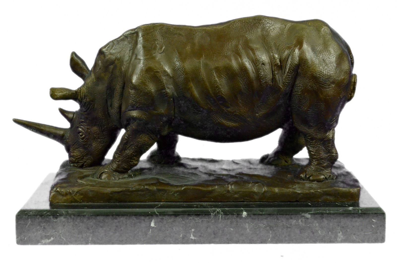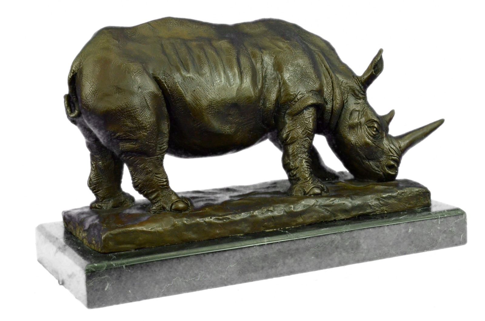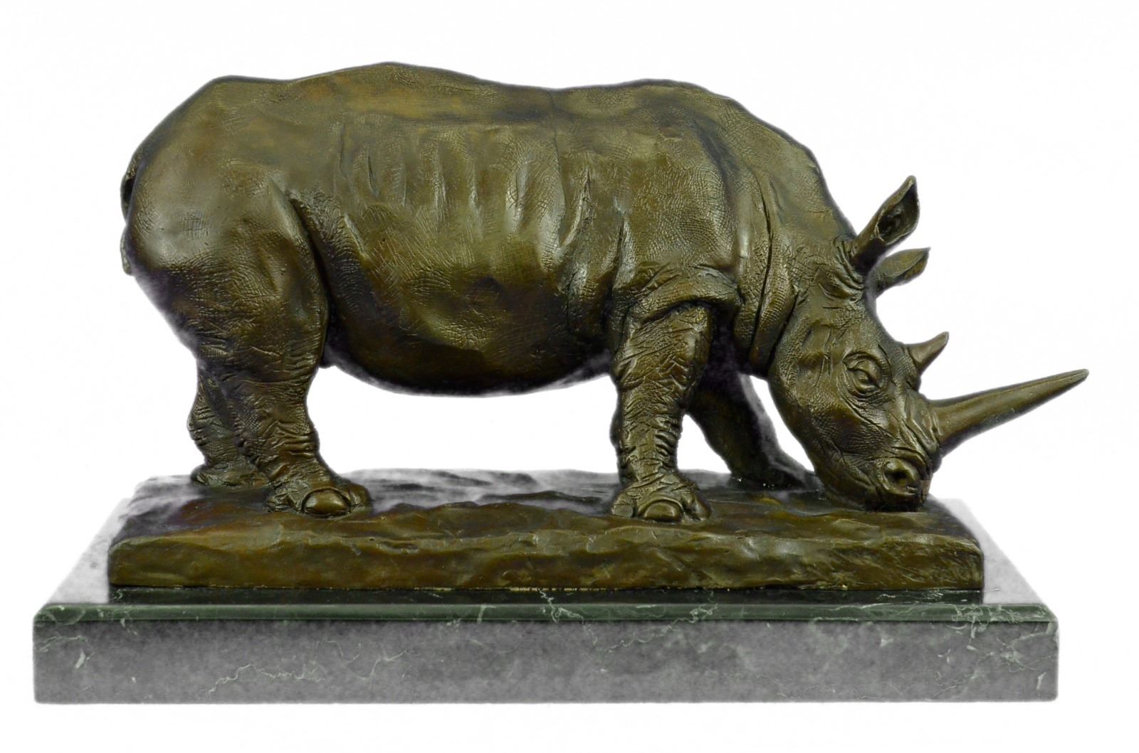The Ancient And Critically Endangered Rhinoceros Is Seen Foraging For Food Among The Vegetation Of The Plains. The Animal Symbolism Of The Rhinoceros Includes Agility, Solitude, Wisdom, Paradox, Freedom, Stability, Gratitude, Longevity, Judgement, Grounding, Peace Of Mind, Self-Assurance,And Perception. The Handmade Bronze Sculpture Was Molded Using The Early Method Of Lost-Wax Casting And Stained With A Brown Patina Finish For Preservation. Bronze Dimensions With Marble Base: Height 9 X Width 14 inches. Weight: 19 Lbs.Please Note: This is a reproduction bronze sculpture from the original molded and signed. This featured bronze sculpture is a recast after the original, and has been done recently. This 100% bronze sculpture is an abstract piece certain to be a conversation piece.Please Note: This is a reproduction bronze sculpture from the original molded and signed. This featured bronze sculpture is a recast after the original, and has been done recently. This 100% bronze sculpture is an abstract piece certain to be a conversation piece.