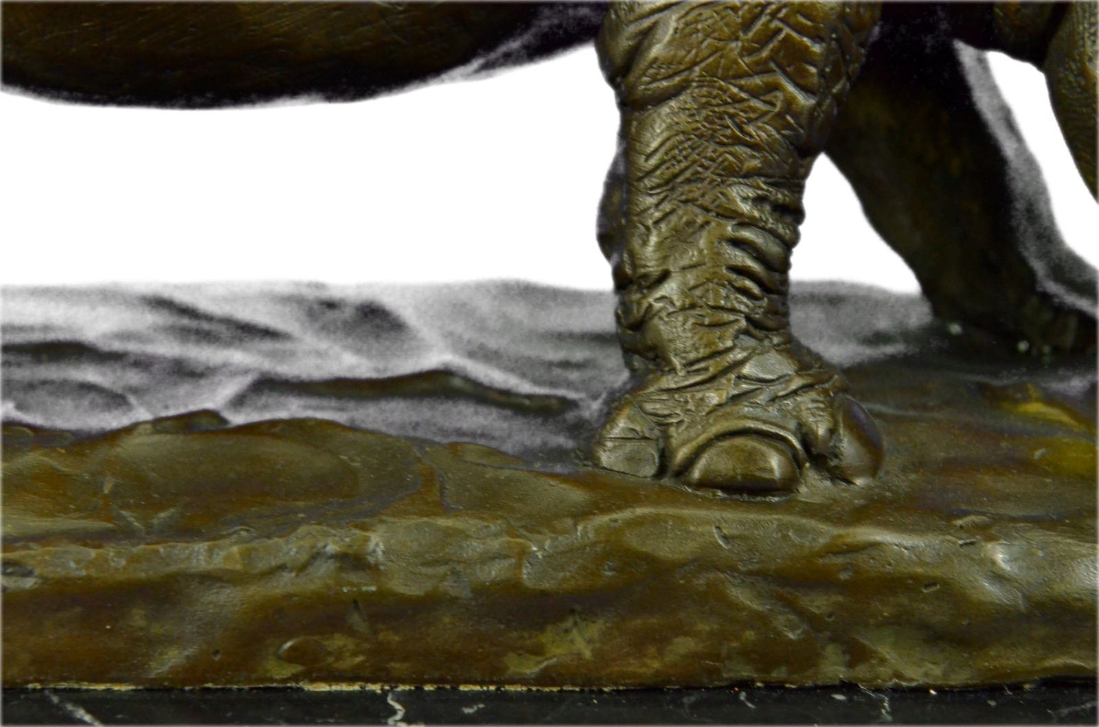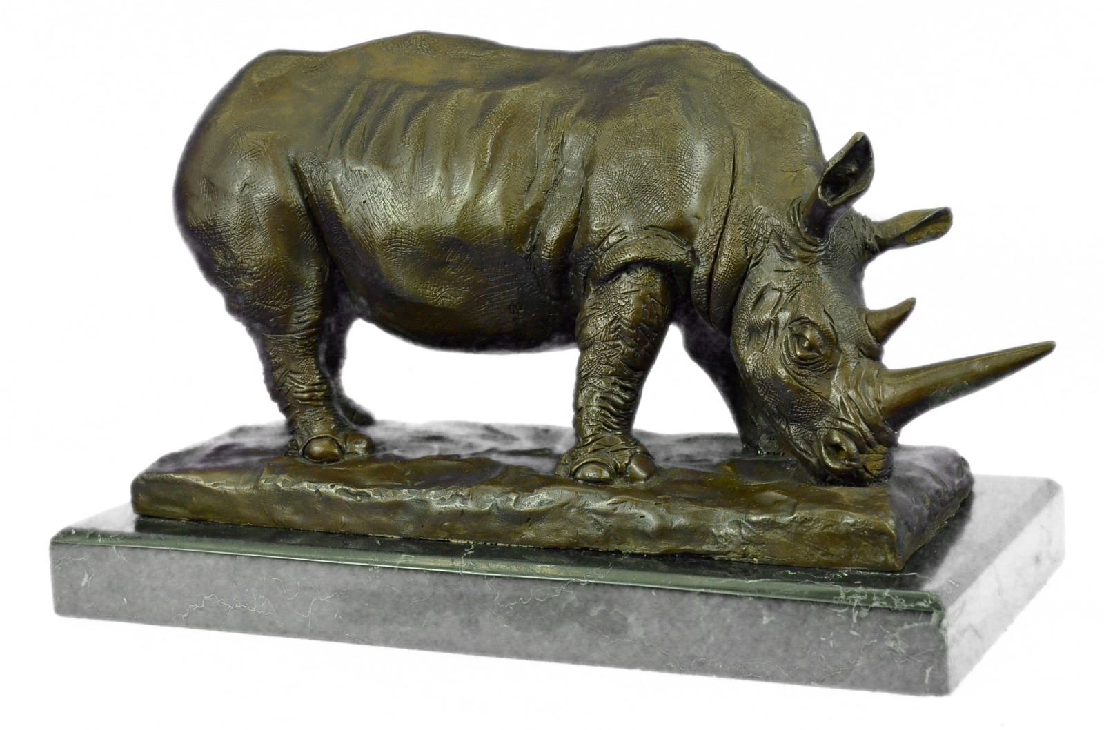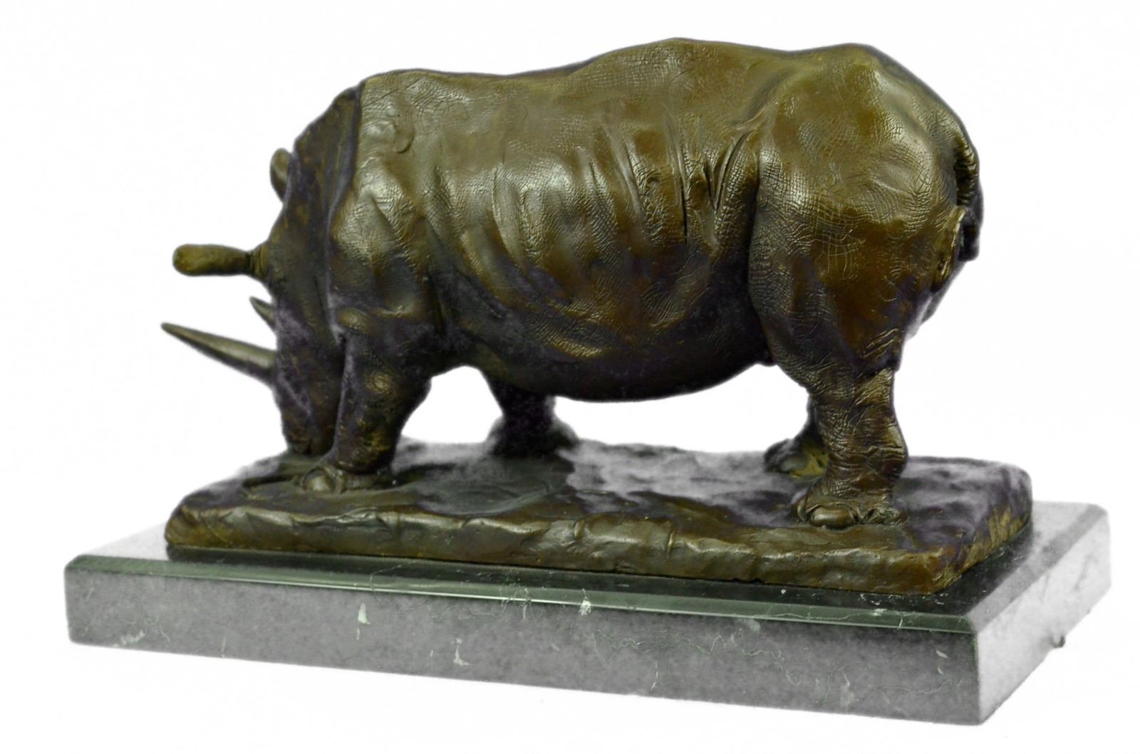 The Ancient And Critically Endangered Rhinoceros Is Seen Foraging For Food Among The Vegetation Of The Plains. The Animal Symbolism Of The Rhinoceros Includes Agility, Solitude, Wisdom, Paradox, Freedom, Stability, Gratitude, Longevity, Judgement, Grounding, Peace Of Mind, Self-Assurance,And Perception. The Handmade Bronze Sculpture Was Molded Using The Early Method Of Lost-Wax Casting And Stained With A Brown Patina Finish For Preservation. Bronze Dimensions With Marble Base: Height 9 X Width 14 inches. Weight: 19 Lbs.Please Note: This is a reproduction bronze sculpture from the original molded and signed. This featured bronze sculpture is a recast after the original, and has been done recently. This 100% bronze sculpture is an abstract piece certain to be a conversation piece.Please Note: This is a reproduction bronze sculpture from the original molded and signed. This featured bronze sculpture is a recast after the original, and has been done recently. This 100% bronze sculpture is an abstract piece certain to be a conversation piece.