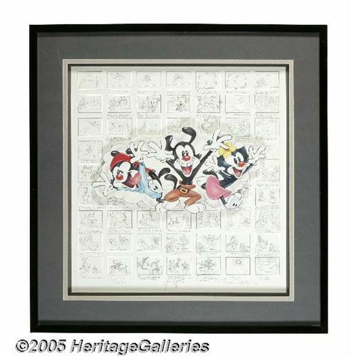 <B>Animaniacs Storyboard Limited Edition Lithograph Print #1189/2500 (Warner Bros., 1994).</B></I> The central image of Warner Brothers, Wakko and Yakko, and sister, Dot were expertly die-cut and mounted above a lithographic print created from the final scene storyboard sequence used by Warner Bros. animators to create the episode, ""I'm Cute!"" Each of these storyboard lithographs was signed by voice artists Rob Paulson (Yakko), Jess Harnell (Wakko), and Tress McNeille (Dot). This print is number 1,189 out of an edition of 2,500. The image area measures 21"" x 22"", and the condition is Excellent. Includes a certificate of authenticity. <BR><BR><B>Important notice:</B> Heritage usually auctions material at the rate of 200-250 lots per hour. On some occasions eBay Live bid software or the Internet may not be able to keep up with the pace of the auction. We recommend placing a realistic absentee bid now as insurance to avoid disappointment. Occasionally the auctioneer may eliminate or reject an eBay Live bid, and the auctioneer may also reopen a lot after the close of the eBay live bidding (usually because we missed an audience bid), and may reject your bid even if it shows you as the winning bidder. By bidding via eBay Live, you agree that Heritage may award the lot to another bidder at its sole discretion under the circumstances described above or any other reasonable circumstances. Since eBay bids are not shown to us until we open the lot on the floor, we treat those bids just like floor bids. In most cases the floor responds before the eBay bid is presented to us, due to Internet lag time, so for consistency we have made it a policy that floor bids are always considered first over tie eBay live bids. Also please note that all Heritage lots purchased through eBay Live carry a 20% Buyer's Premium. Please make sure you read the Terms and Conditions before you bid. This lot is being auctioned in conjunction with a live floor auction by Heritage Galleries & Auctioneer
