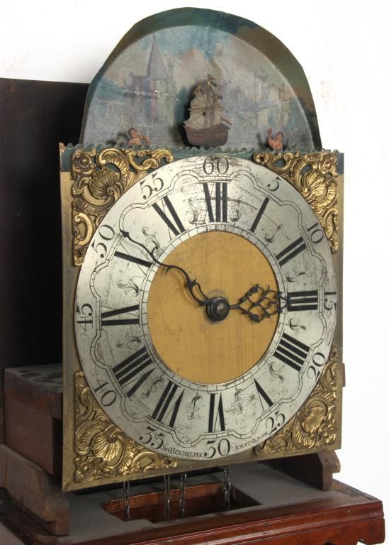 Animated Rocking Ship Dutch Hood Clock. Dial has a 10 in. silvered chapter ring with incised black Roman hour numerals & 5 minute numbers, pierced black hands, gilt filigree spandrels and signed Jan Hermelink, Amsterdam; dial has a painted harbor scenic arch at the top with rocking ship flying Dutch flags and mermaids on either side, ship and mermaids rock with the beat of the pendulum. Quality brass, weight driven movement has recoil escapement, drop hammer bell hour strike, long wood pendulum with brass bob and brass covered weight. In good running condition. In a walnut case with arched top bonnet, spun brass spherical finials and lower drop section with oval cutout with brass urn overlay exposing the pendulum bob. 51 in. high x 15 in. wide x 7.5 in. deep.