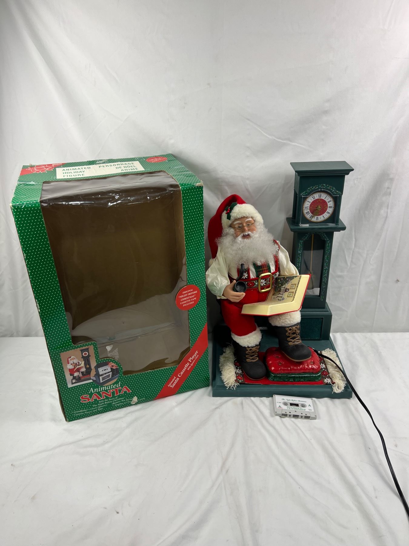 Santa moves and cassette player plays tape. Unknown if clock works. Measures 22" tall.
