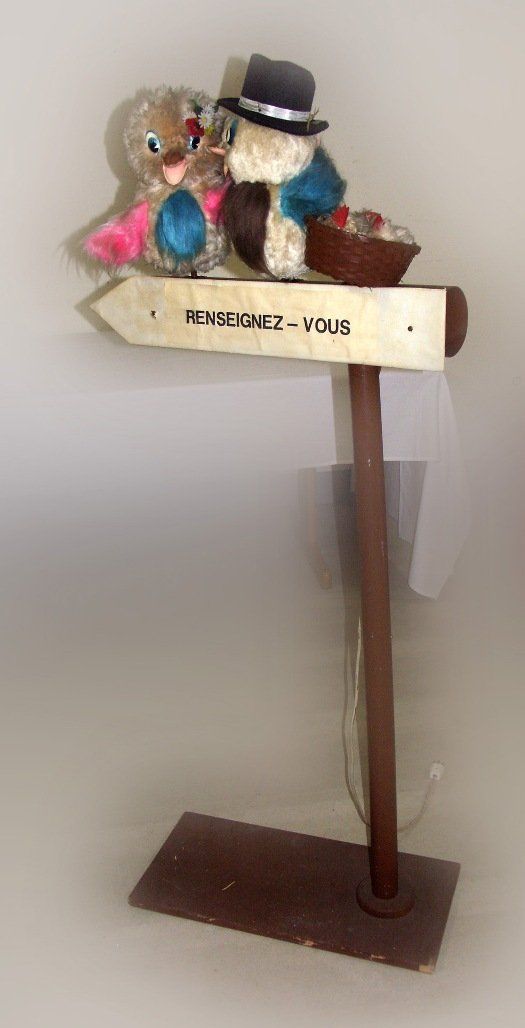 Schaufensterautomat «Vogelpaar» auf Wegweiser. Funktionstüchtig. 155cm hoch. Hersteller unbekannt.